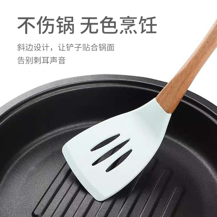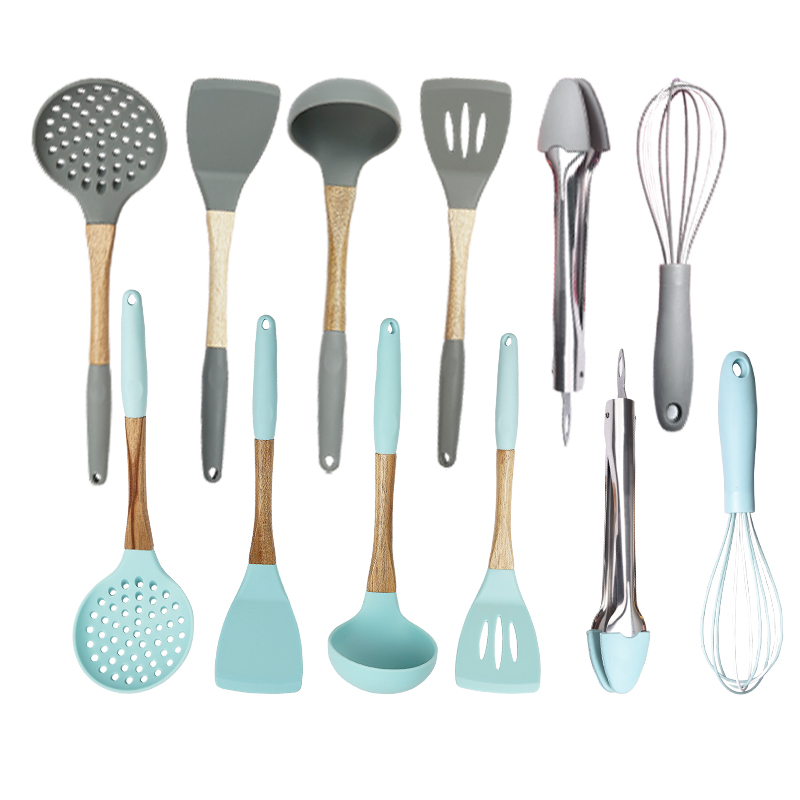 Spoon gray spatula gray leak shovel Gray colander Gray small food clip Gray large food clip Gray whisk Gray spoon Blue spatula Blue leak shovel Blue colander Blue small food clip Blue Large food clip Blue