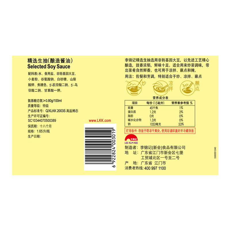 Lee Kum Ki Ki selected raw soy sauce 1900ml brewed soy sauce super cold fried vegetables household condiment dip pickled