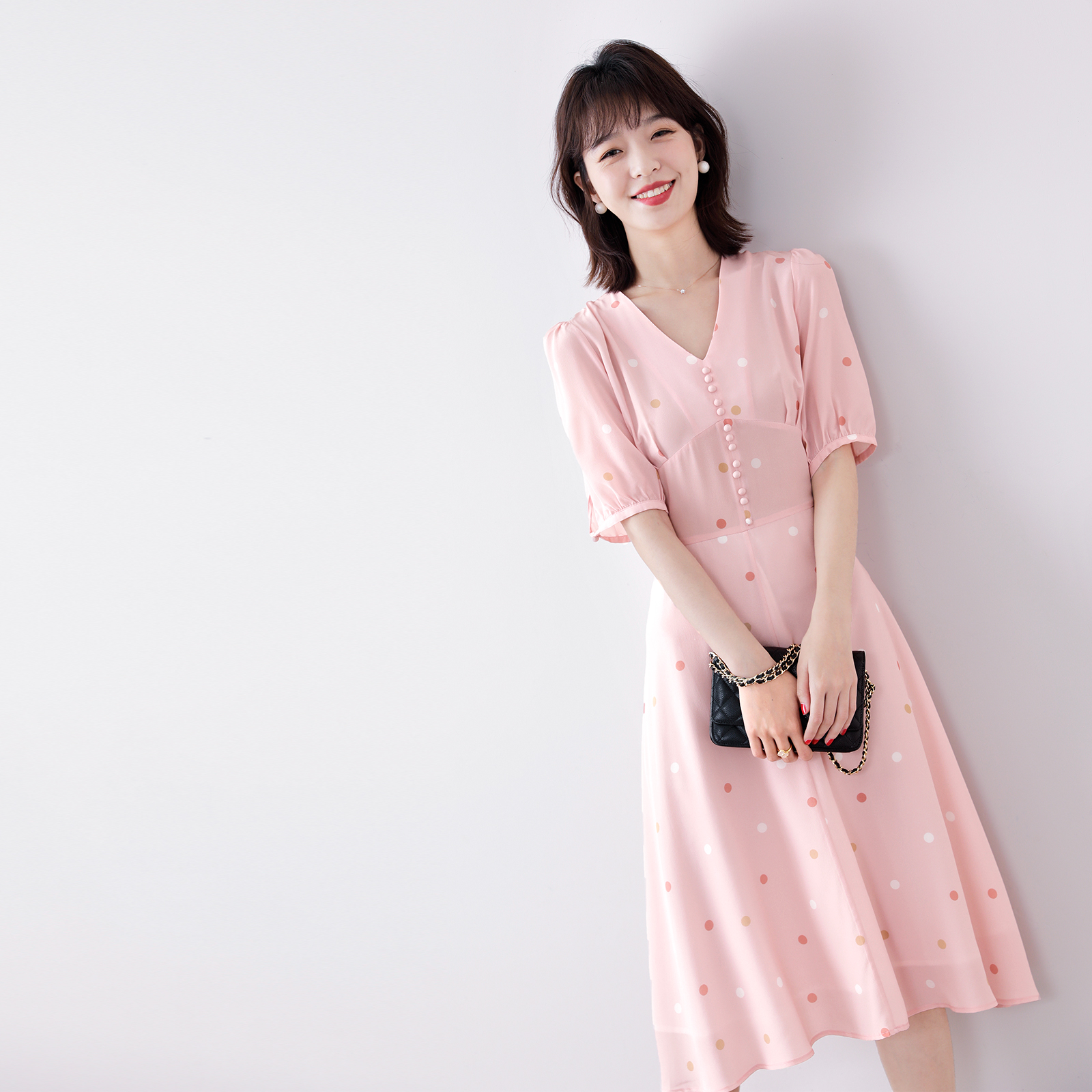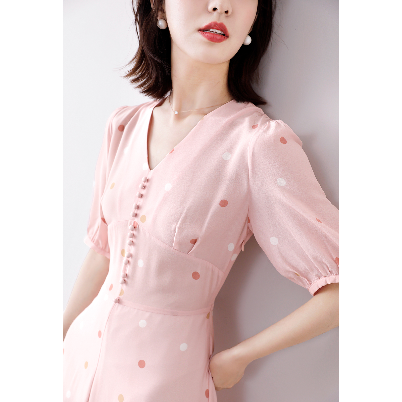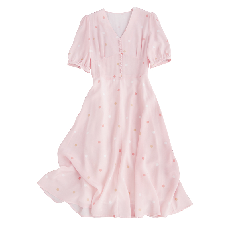 Full of soft and beautiful temperament to love to heart ~ Pot point printed handmade bag with long version V collar genuine silk dress