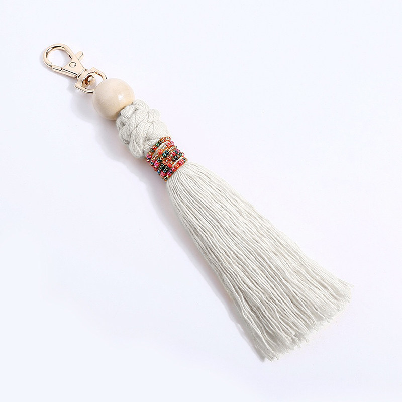 Tassel keychain hand-woven bohemian style rice bead wood beads cotton rope knot pendant women's summer bag pendant
