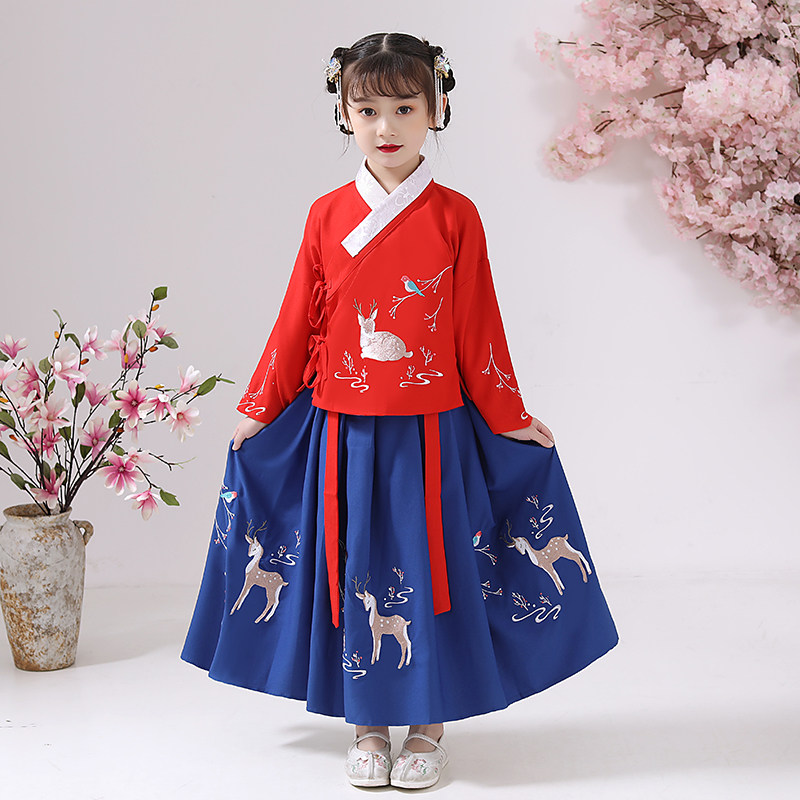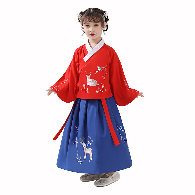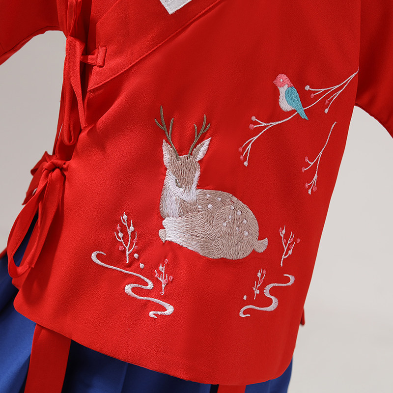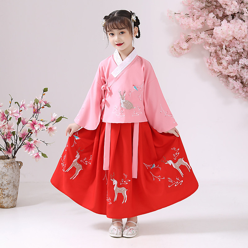 Improved Hanfu Girls' Chinese Style Ruskirt Cross-collar Antique Tang Suit Baby Children's Spring Dress Long Dress Sika Deer Embroidery