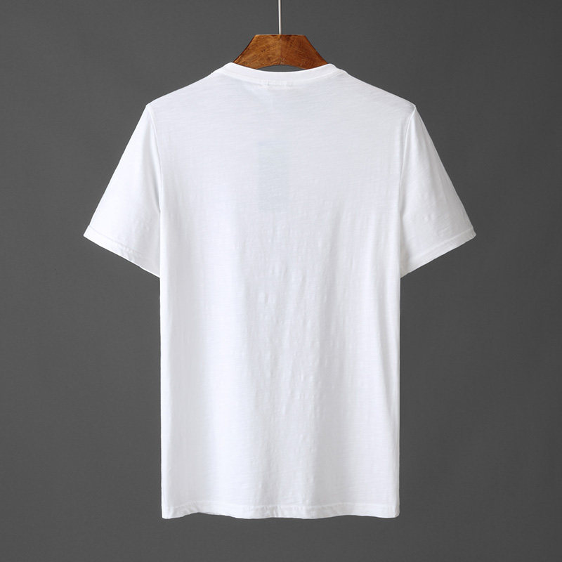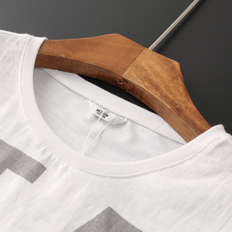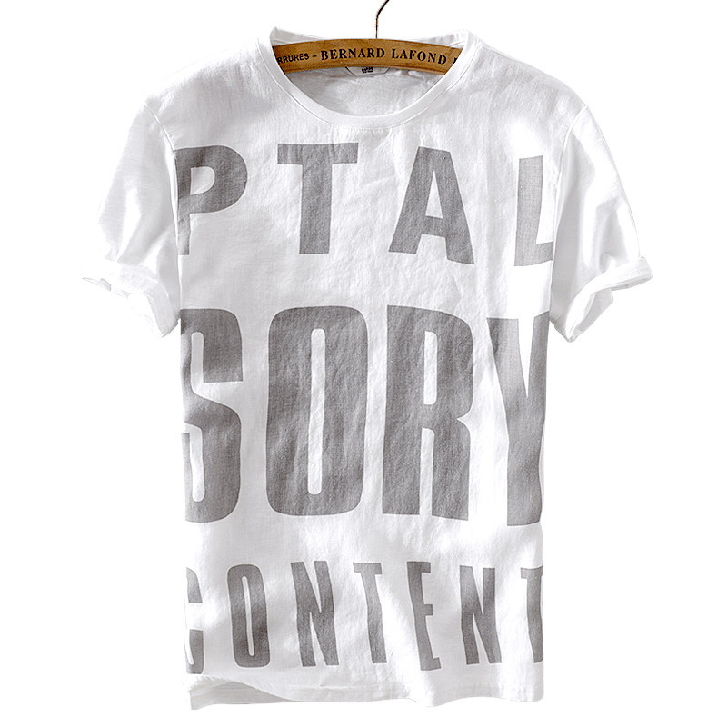 Big English letters printed stitching linen short-sleeved T-shirt men's youth casual linen white cotton linen T-shirt top E