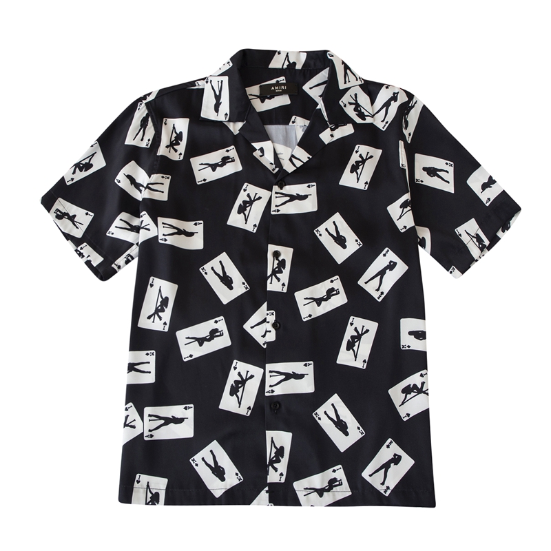 Roaring small eyes Amiri style 2020SS black and white playing card high street imitation silk shirt short sleeves