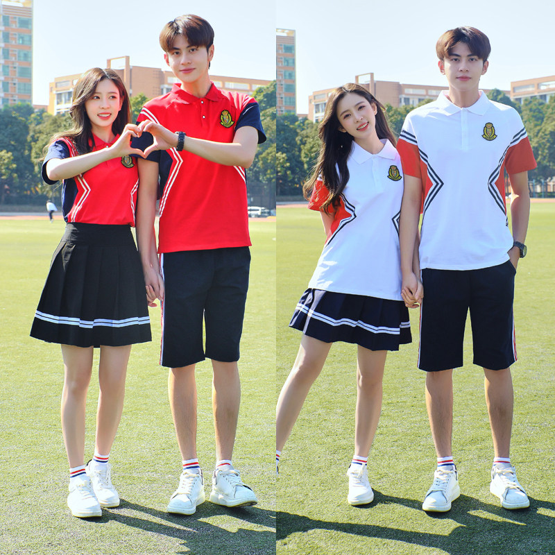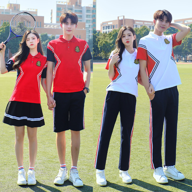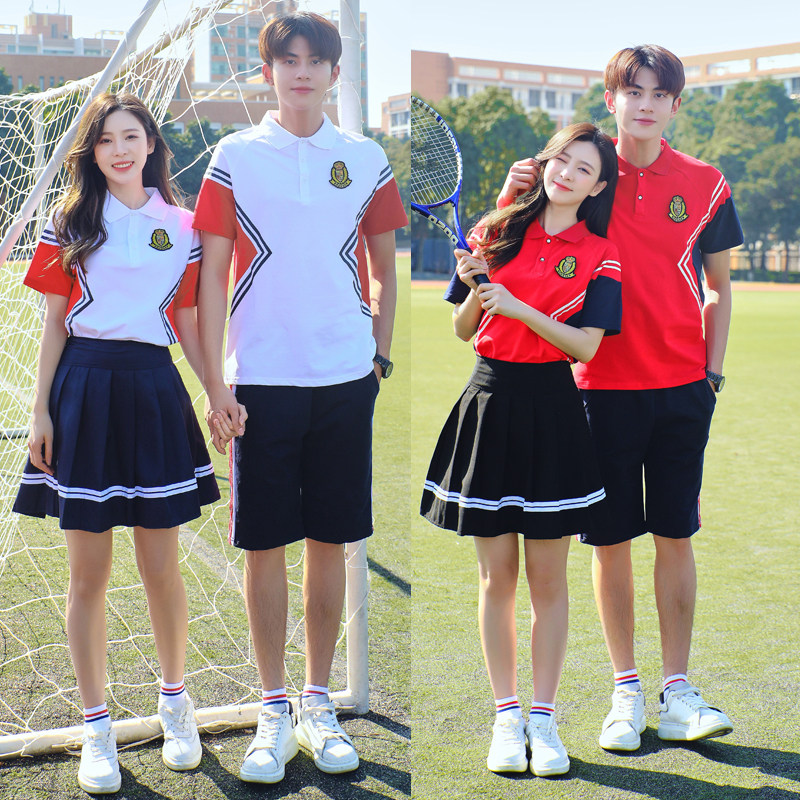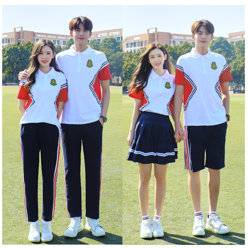 Red T-shirt Black Striped skirt Red T-shirt Navy blue Shorts White T-shirt Navy blue shorts White T-shirt Navy blue Skirt White T-shirt Navy Blue Trousers Red T-shirt Navy Blue Trousers Single T-shirt
