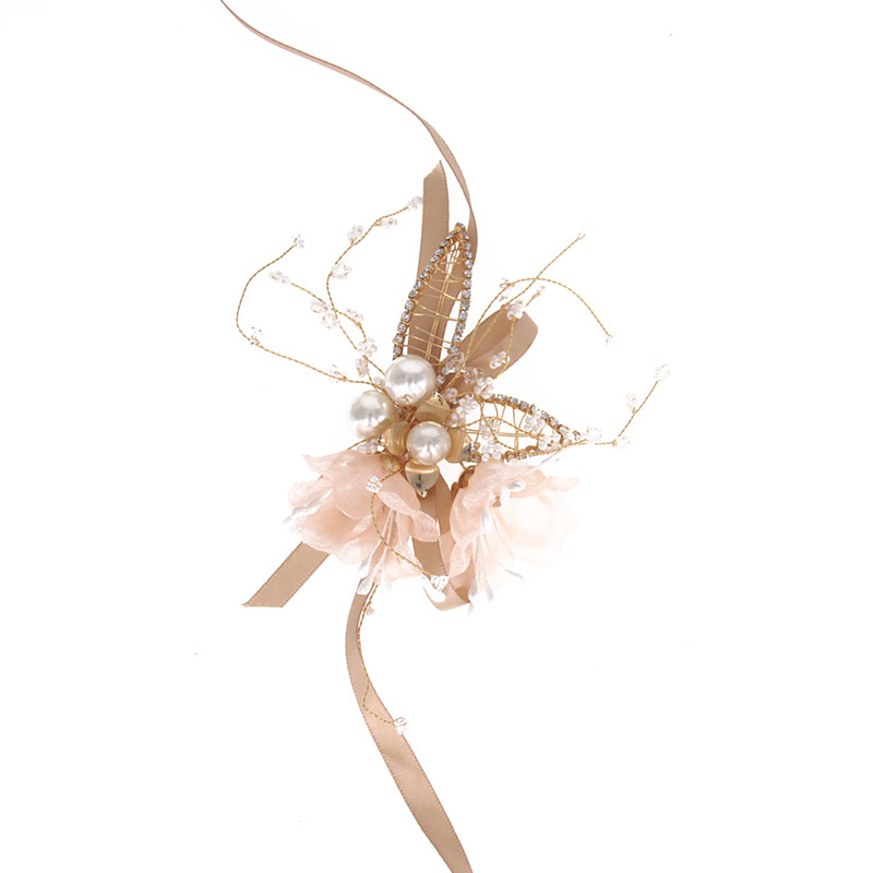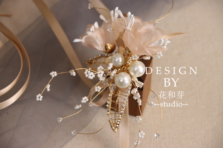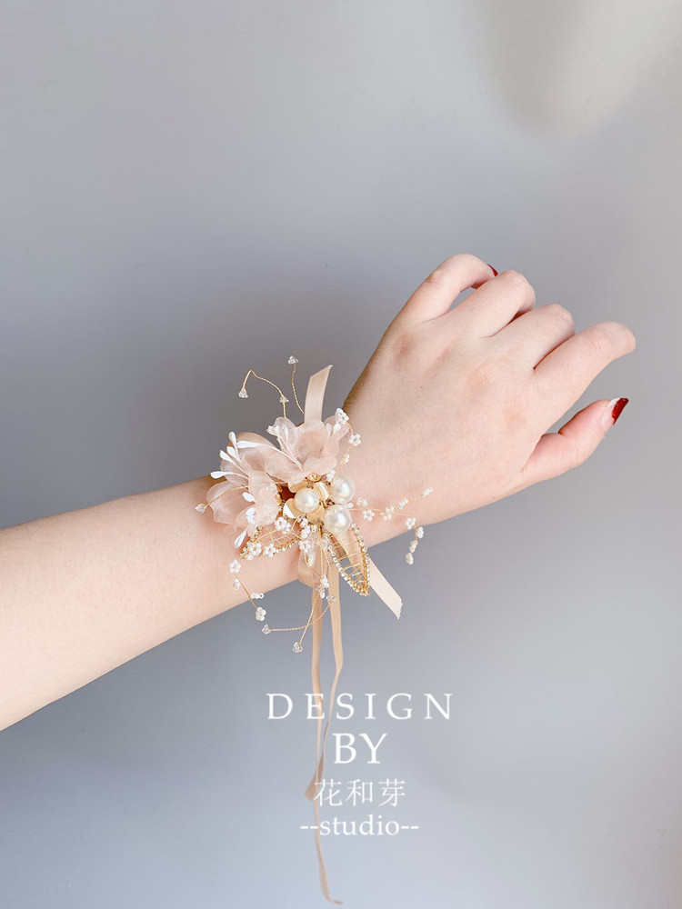 New original wrist flowers with meritocratic champagne pink flower water drill leaves Pearl bridal bridesmaids to perform handmade