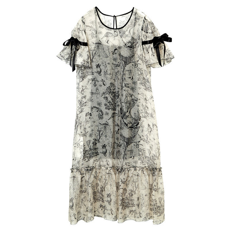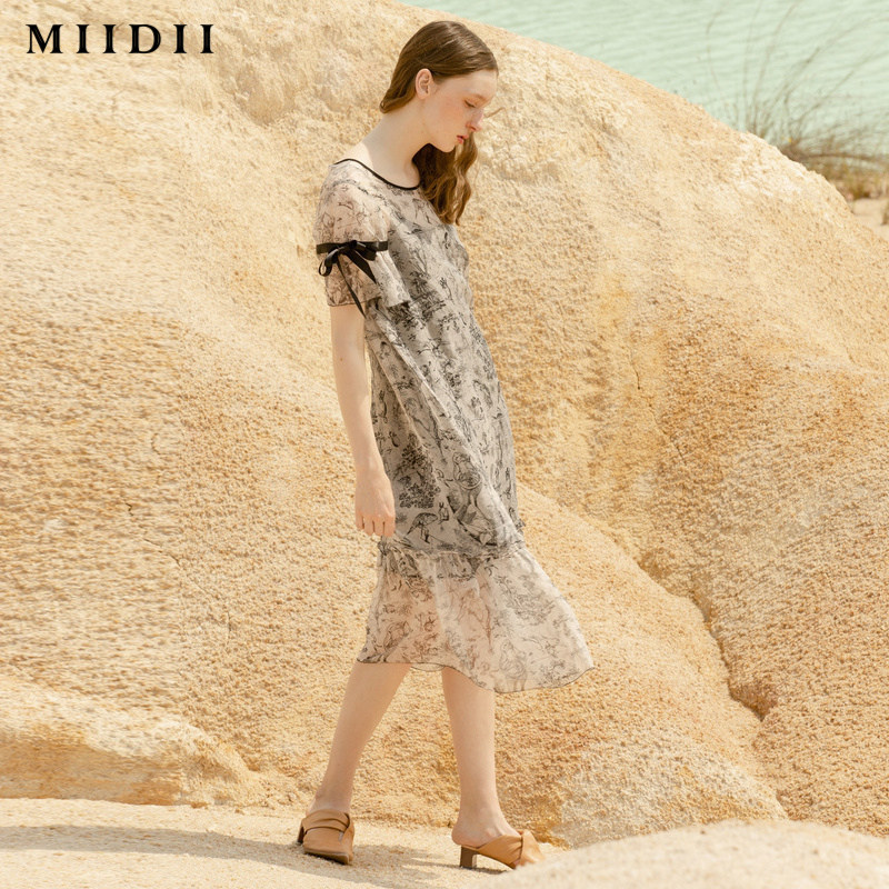 MIIDII Riddle Summer Dress New Loose Lotus Leaf Cuff Real Silk Printed Foreign Assembly Hitch 202ML0990