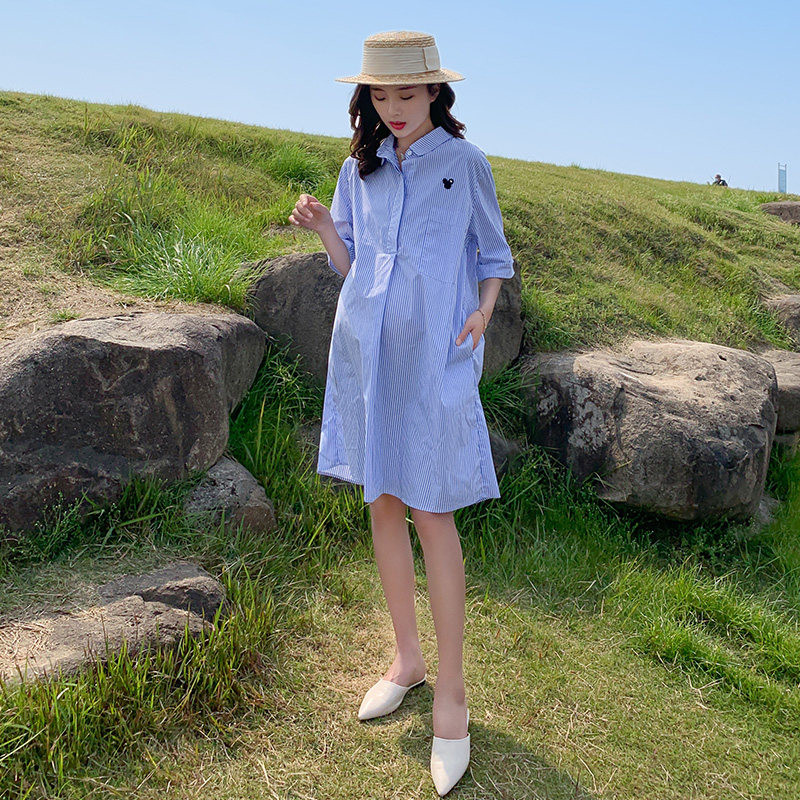 Maternity dress shirt dress 2021 summer new fashion medium and long version striped top trendy mom personality dress summer
