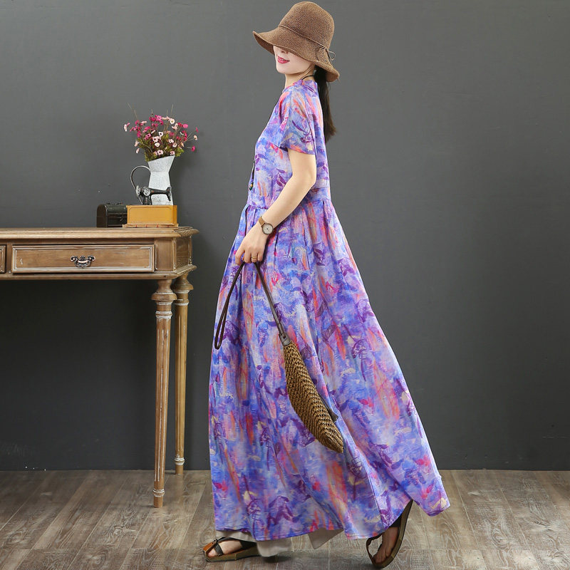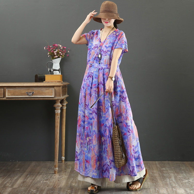 September Card pure Hemp Original Design High Branch High-end Display Slim Large Hem Skirt Long Skirt Short Sleeve Foreign Dress 9062