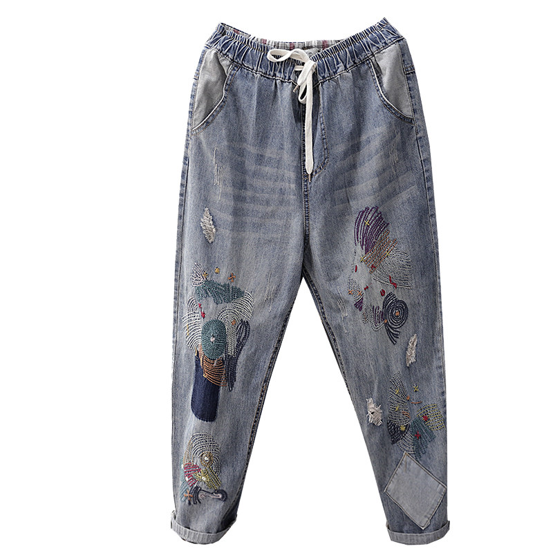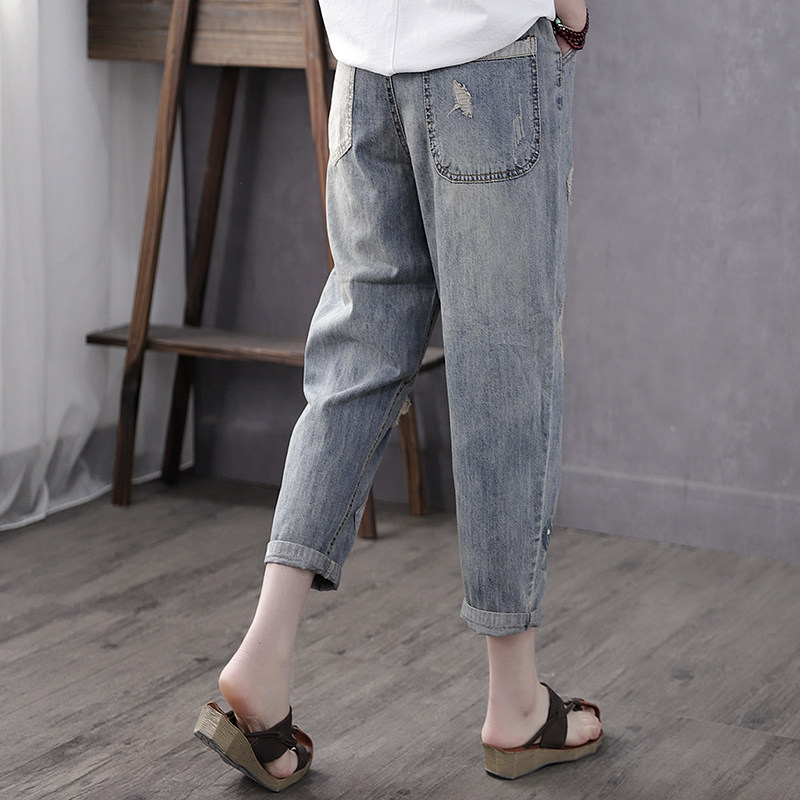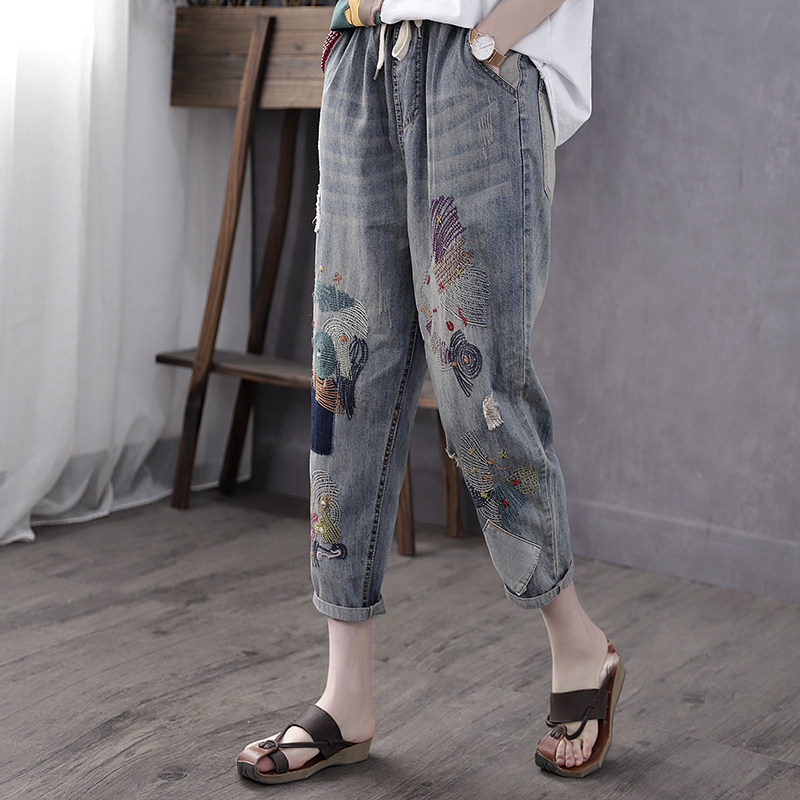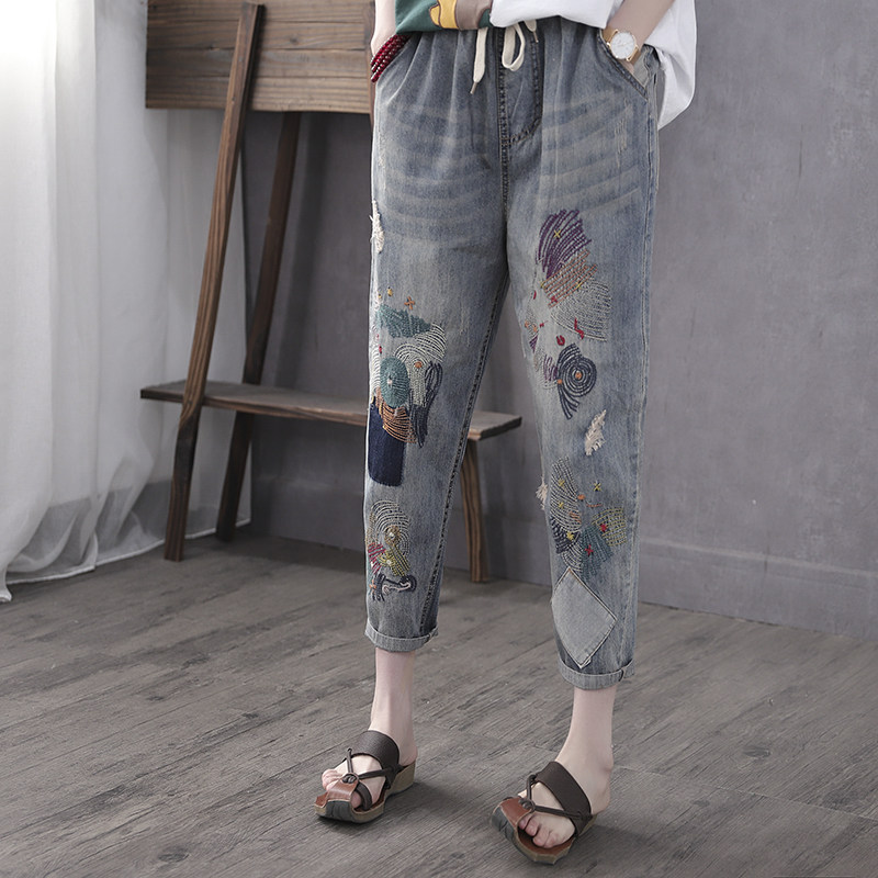 Han Suoyi retro literary Spring Summer new embroidery Capri pants women's jeans women slim small feet Haren pants