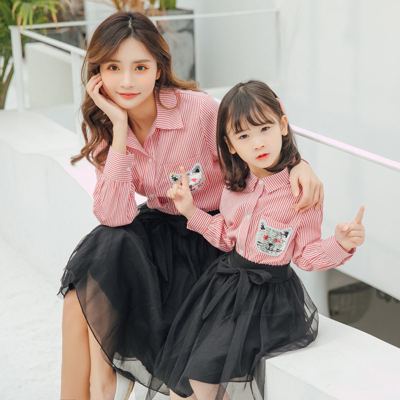 Middle-aged children's parent-child wear striped shirt mesh skirt suit 2022 spring and autumn new fashion mother and daughter two-piece suit