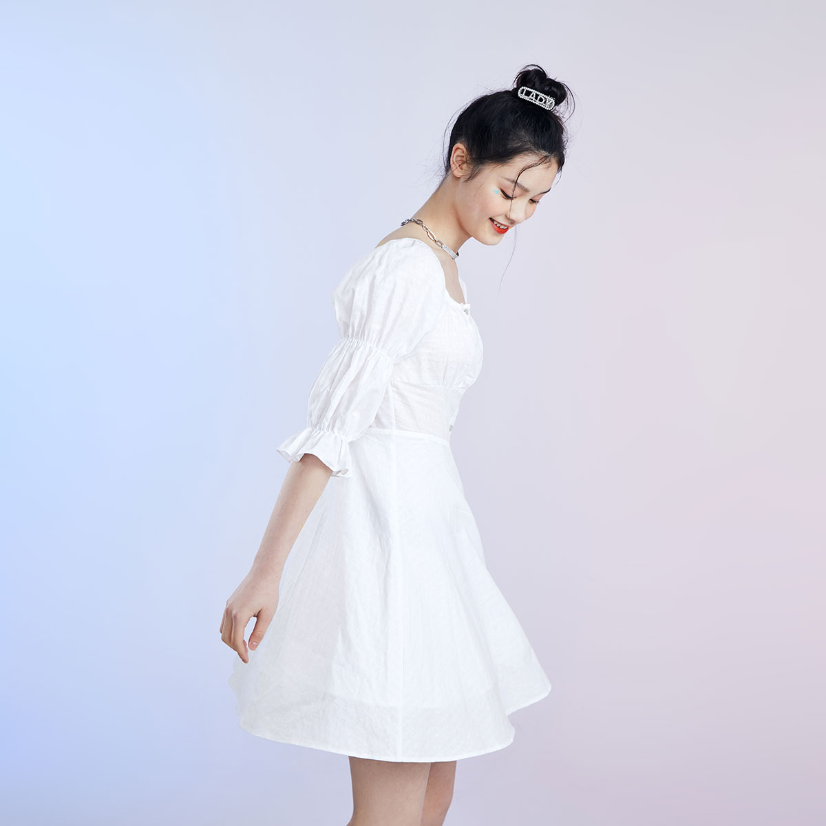 Taiping bird white square collar dress women 2021 summer new bubble sleeves high waist waist French retro dress women