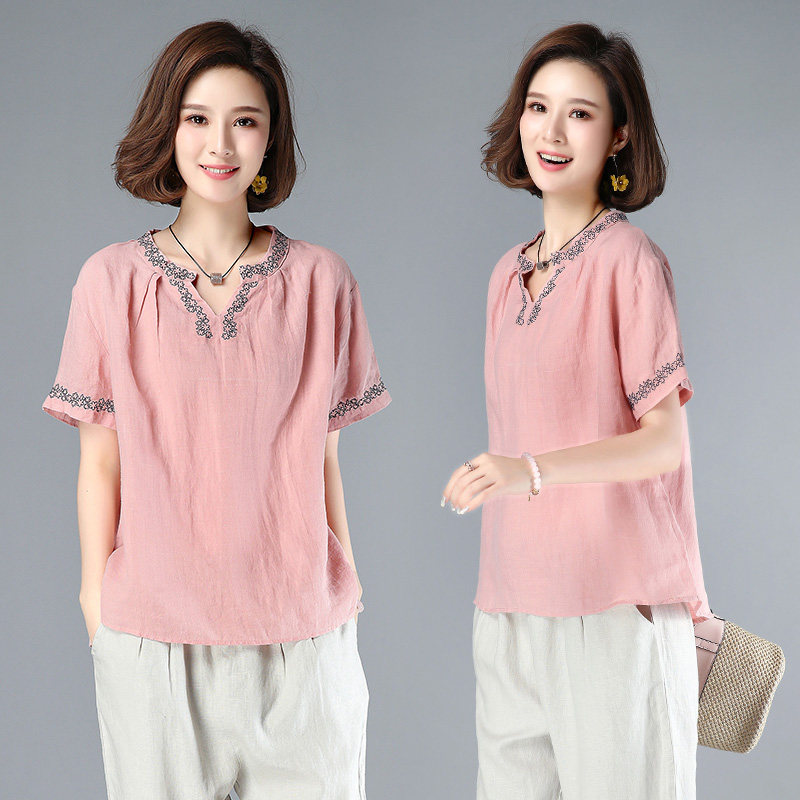 Mom short-sleeved t-shirt women's linen 2021 summer new 40-year-old middle-aged summer top women's loose small shirt