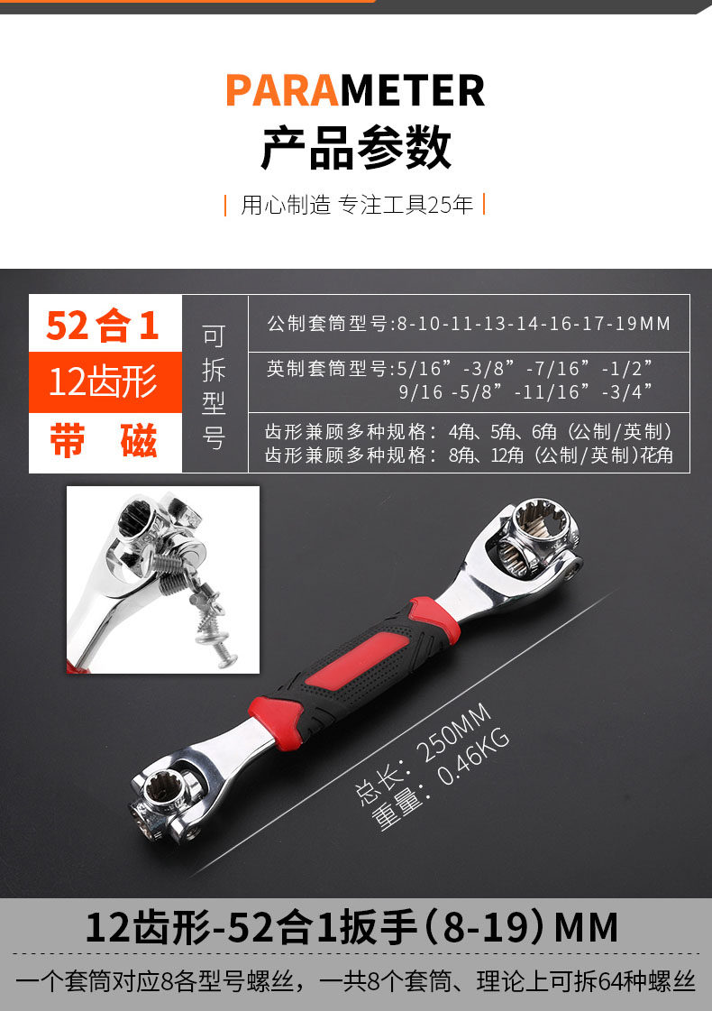 Socket wrench set 52-in-1 universal wrench German 360-degree multi-function 8-in-1 tube plate hand tool