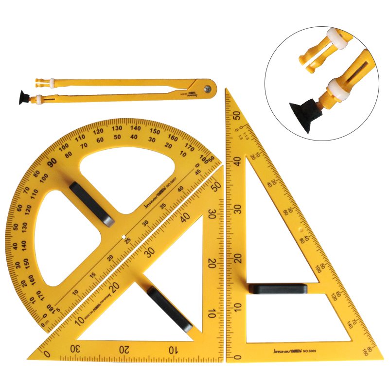 Plastic chalk compasses Plastic multi-purpose compasses (non-magnetic)Plastic multi-purpose ruler (non-magnetic)protractor with pointer (non-magnetic) 45 degrees triangle (non-magnetic) 60 degrees triangle half meter