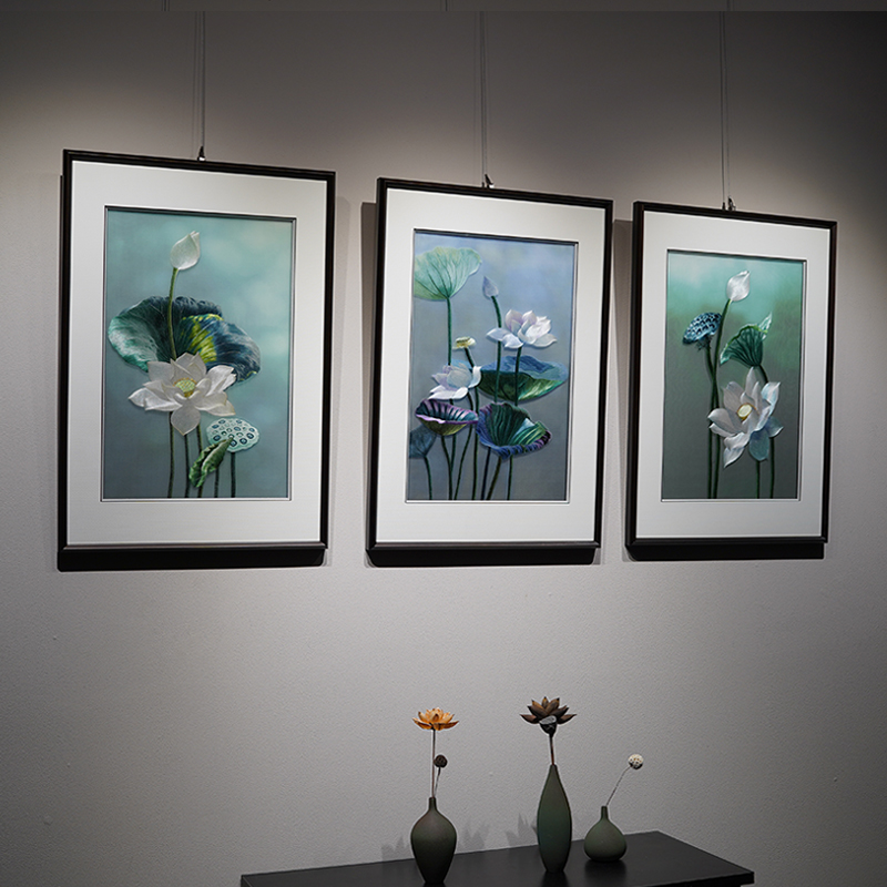 Su Embroidery Finished Product Hung Painting Living Room With Frame Triple Decoration Painting Lotus Oil Painting Modern Pure Hand Embroidery China Ancient Wind