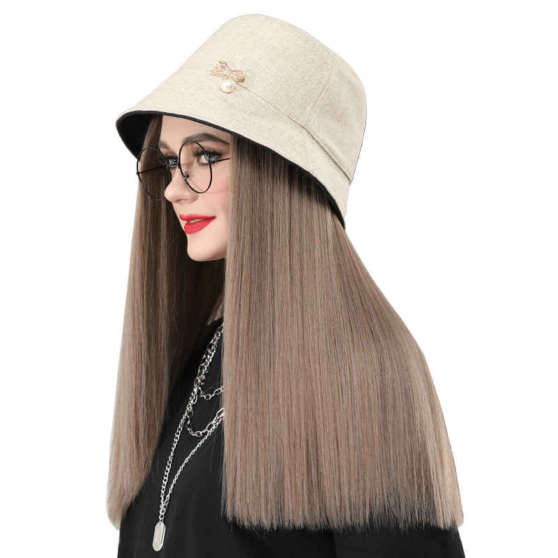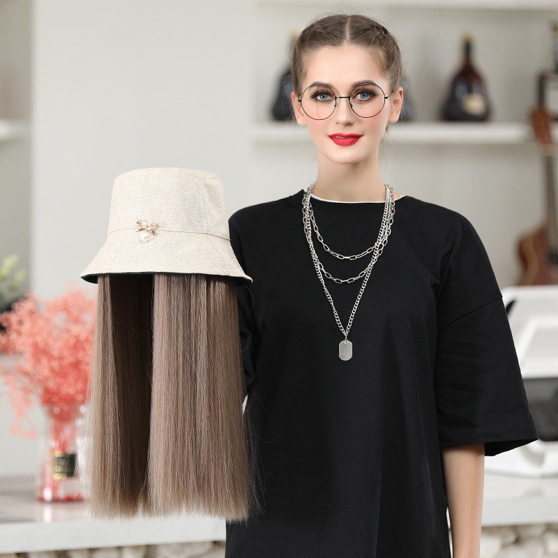 Wig hat one fashion net red autumn and winter wig female long hair fisherman hat with wig simulation long straight hair