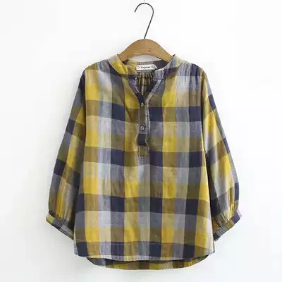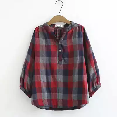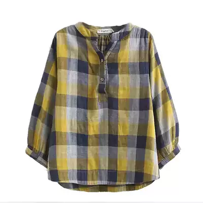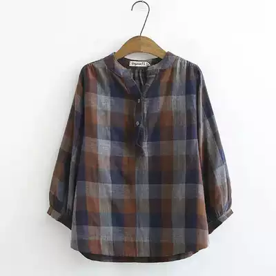 2021 autumn dress middle-aged cotton linen plaid short sleeve T-shirt loose fashion foreign school mother dress national style shirt female summer
