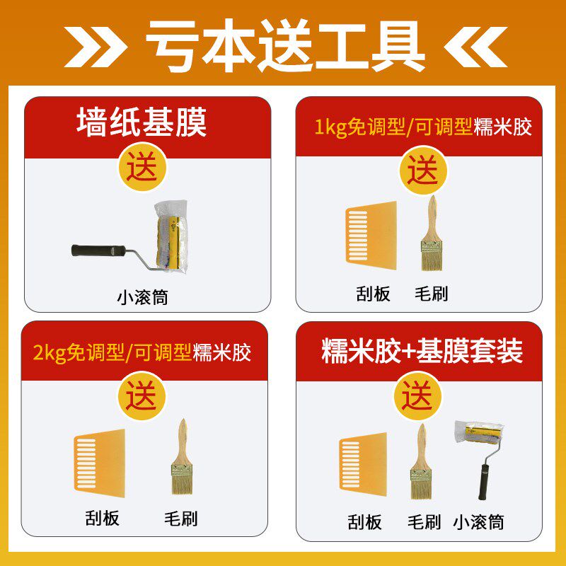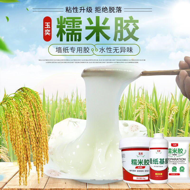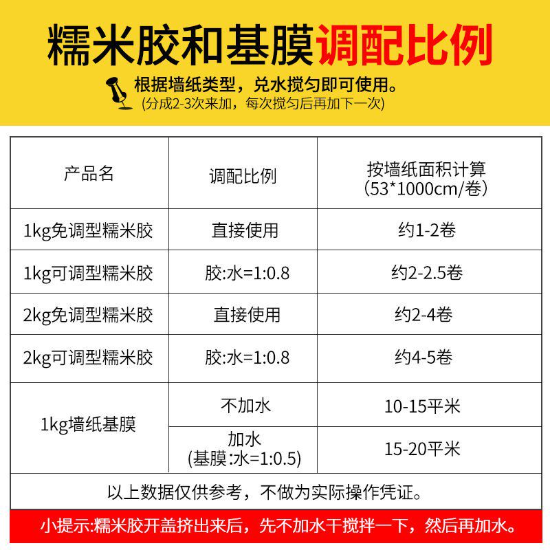 1kg free-adjusting glutinous rice glue 1-2 rolls of wallpaper 1kg adjustable glutinous rice glue 2-3 rolls of wallpaper 1kg permeable base film 15-20 square meters 2kg free-adjusting glutinous rice glue