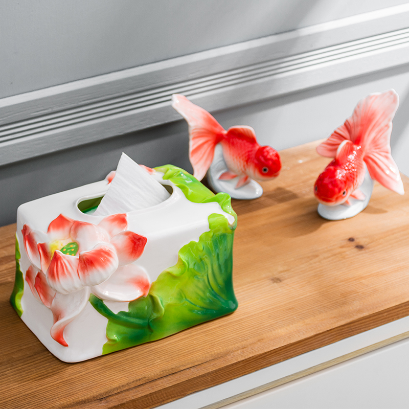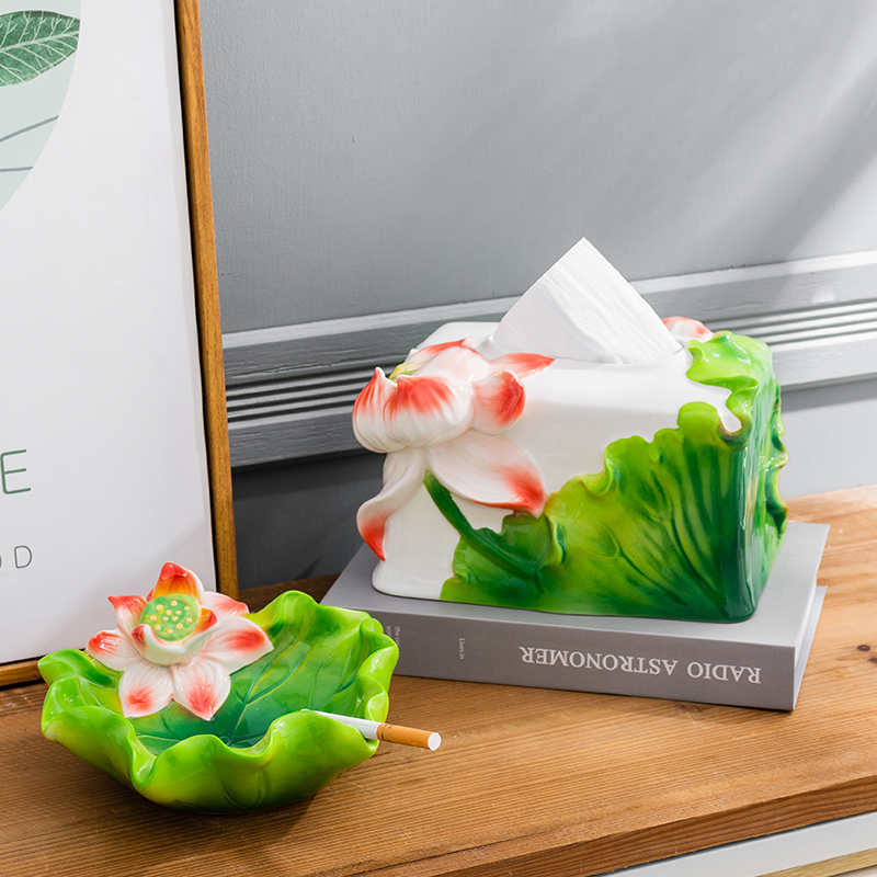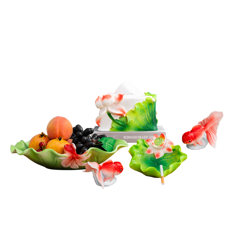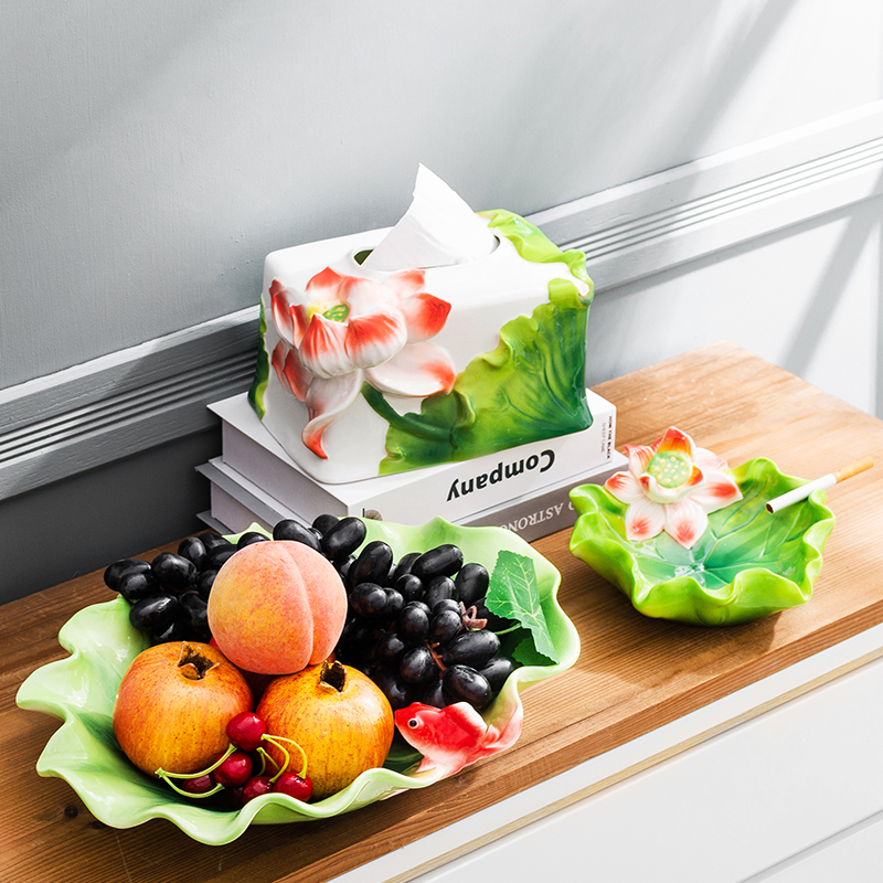 Hand-painted (Lotus Pond Pleasing) Tissue Box Hand-painted (Lotus Pond Pleasing) Ashtray Hand-painted (Lotus Pond Pleasing) Fruit pan hand painted red (carp play water) a pair of green small (lotus leaf) dried fruit pan green large (