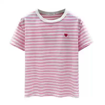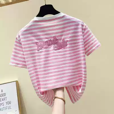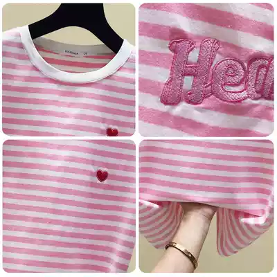 Korean striped T-shirt women's short-sleeved 2021 new summer cotton loose love embroidery half-sleeved round neck top