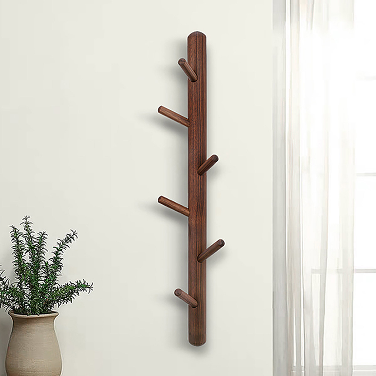 Walnut six hook tree branch wall hanging coat rack to send screws and hole-free glue