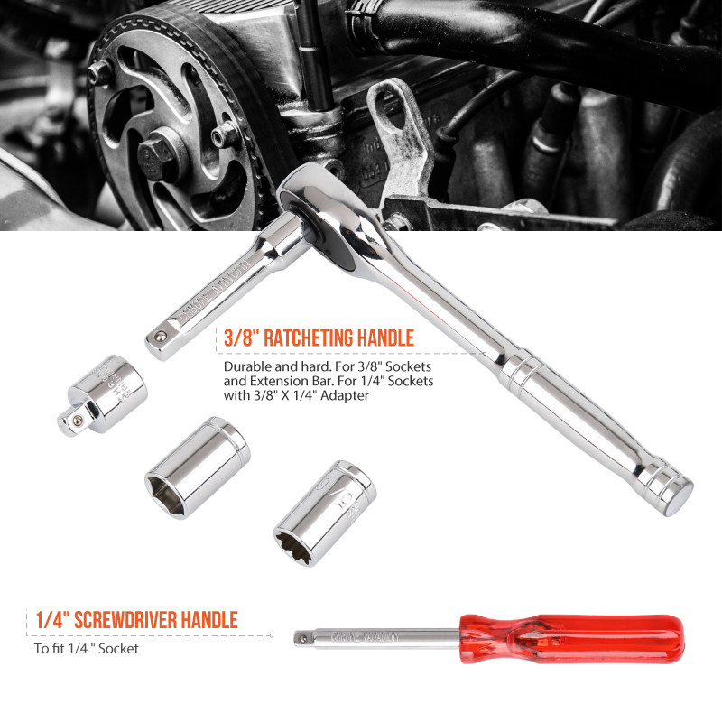 52-piece set (1 4&3 8) Promotional 39-piece set (metric sleeve) 38-piece set (metric sleeve) 94-piece set (1 4&1 2 metric sleeve) 121 piece set (1 4&3 8&1 2) 150 piece set (1 4&3 8&1 2) 216 piece set (1 4&3 8&1 2)