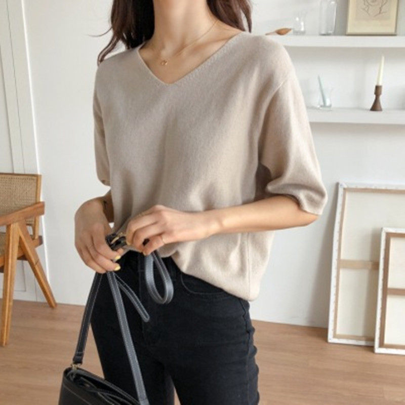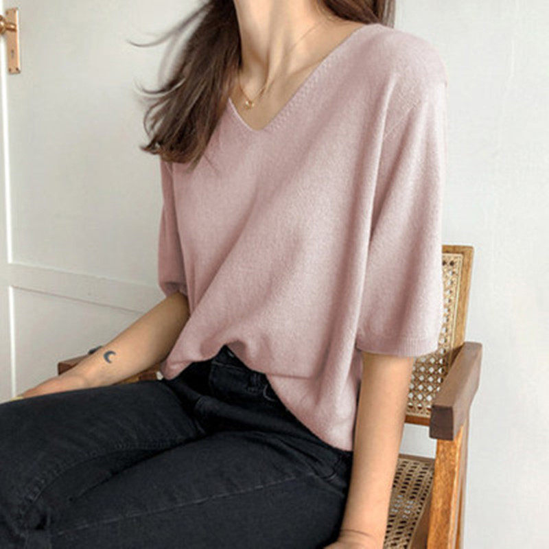 Ice silk sweater women's summer thin section 2021 new Korean version pullover loose new half-sleeve V-neck short-sleeved top
