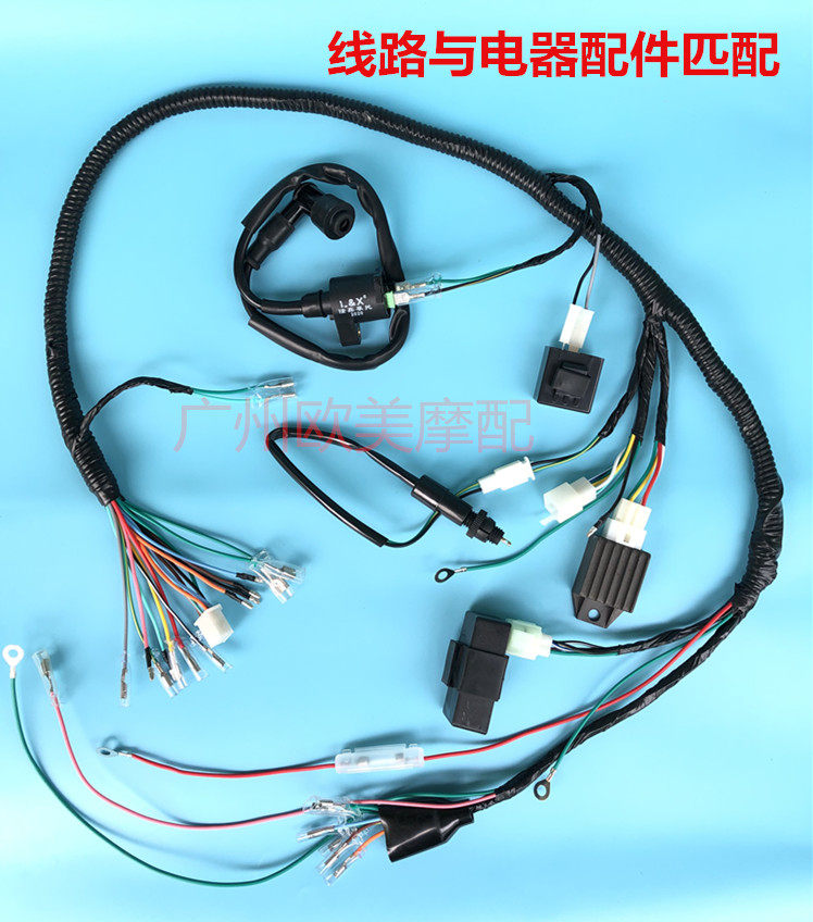 One foot circuit, one left and right switch, one pair of high-voltage packs, one (double insert) stabilized rectifier, one igniter, one (round insert) flasher, one horn, one brake sensing line set, one Lifan left switch