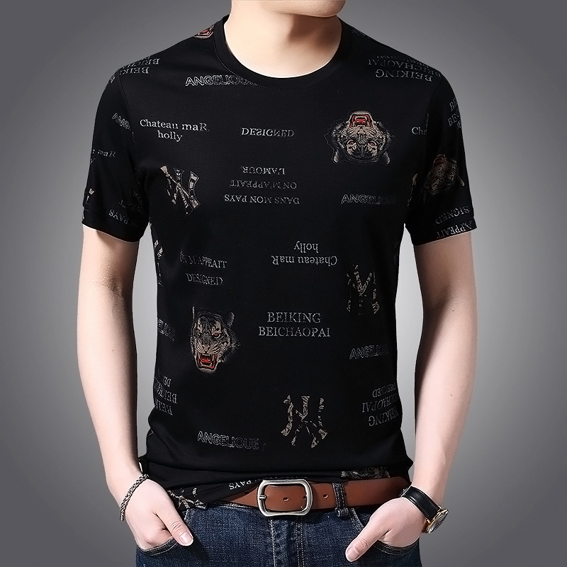 Tide Card Short Sleeve T-shirt Male Round Collar Summer New Ice Silk Blouse Easy Comfort Pro-Skin Plus Hypertrophy Size Silk Light Cotton