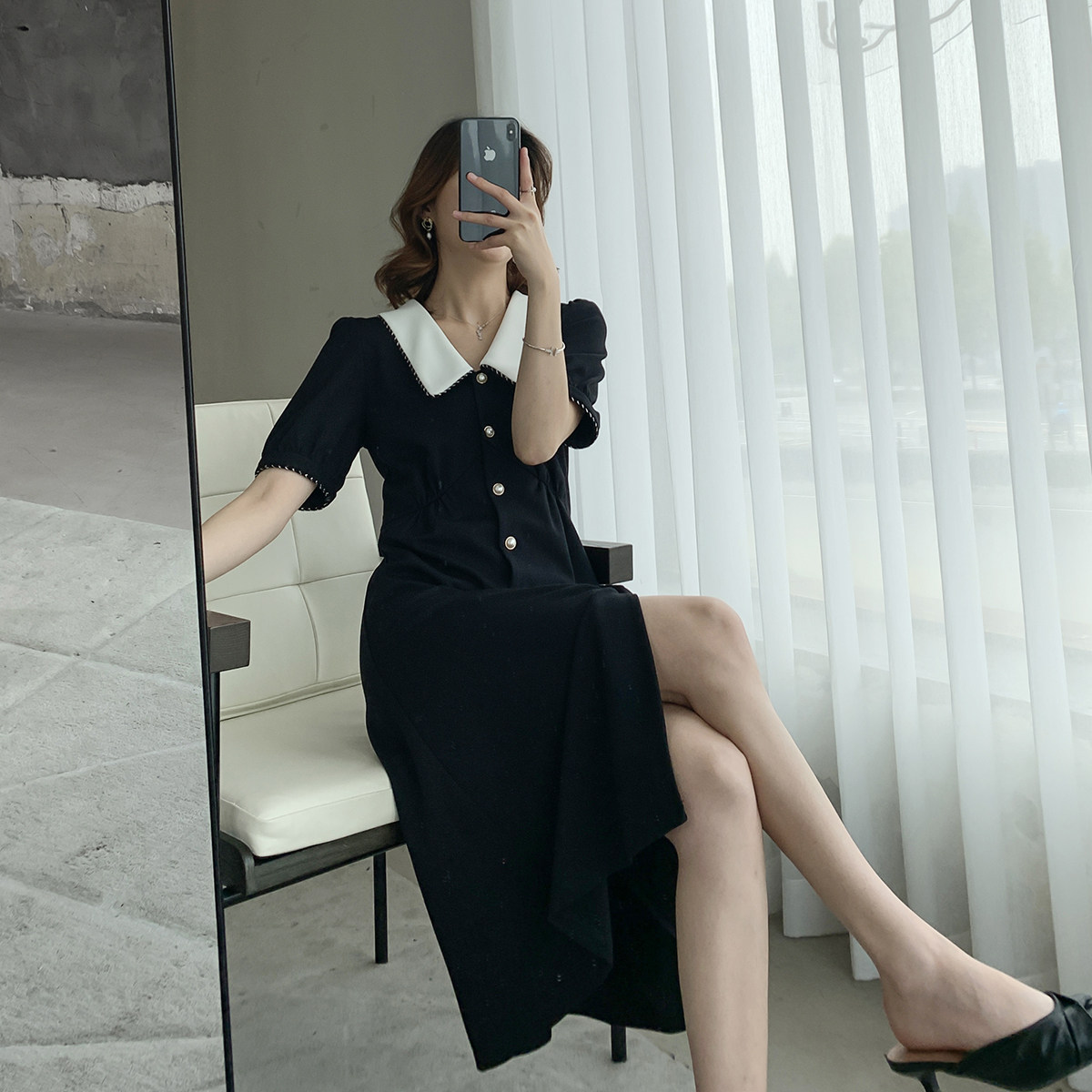 Goo Custom Black Ocean Dress Women 2022 Summer New Cashew Slim Temperament Long Version Over Kneecap Black Dress