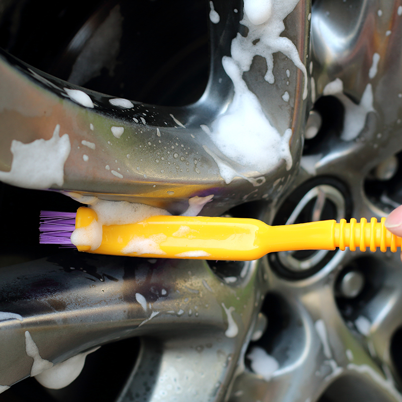 Car with cleaning brush corners and gaps details fine scrubber head corners sill wheel hub engine brush decontamination