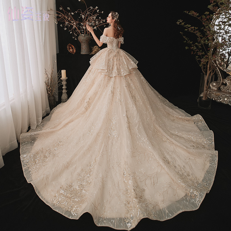 Word shoulder French main light wedding dress 2020 new big tail high waist pregnant woman starry sky 2021 bridal luxury
