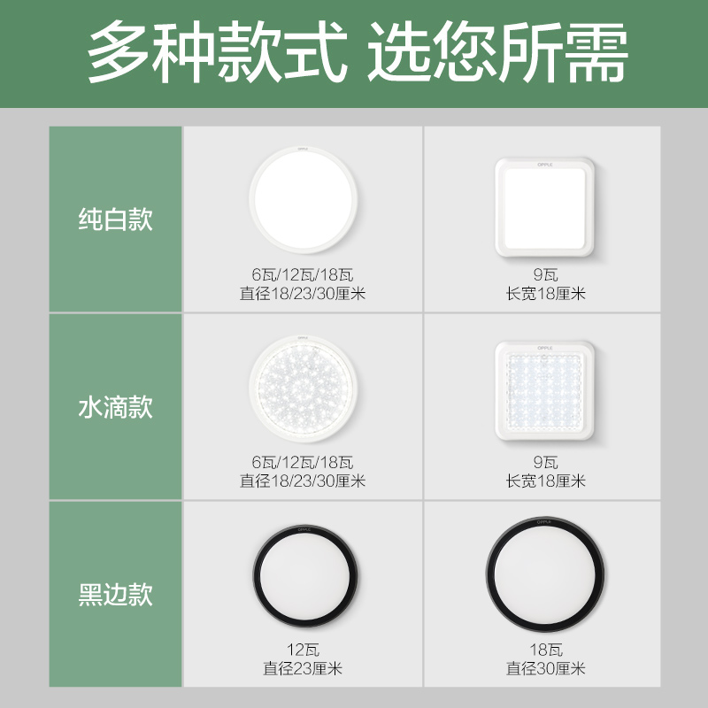 (Pure white-round) 6 watts diameter 18cm (pure white-round) 12 watts diameter 23cm(pure white-round) 18 watts diameter 30cm (pure white-square)9 watts