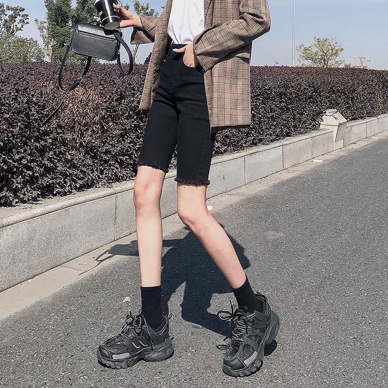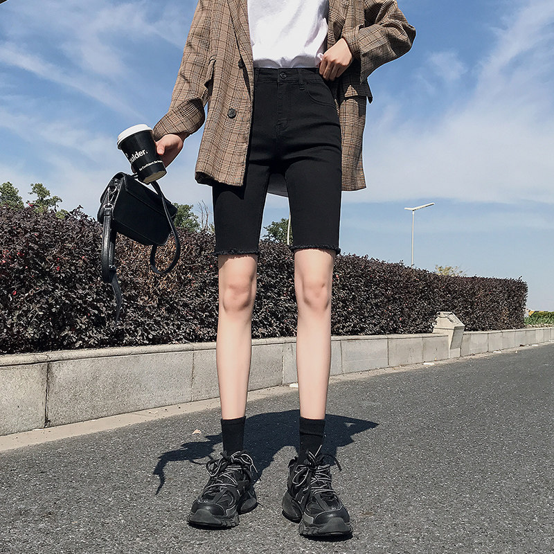 Black Broken Hole Jeans 50% Pants Women Summer 2022 New Korean version High waist Skinder slim fit net red shorts