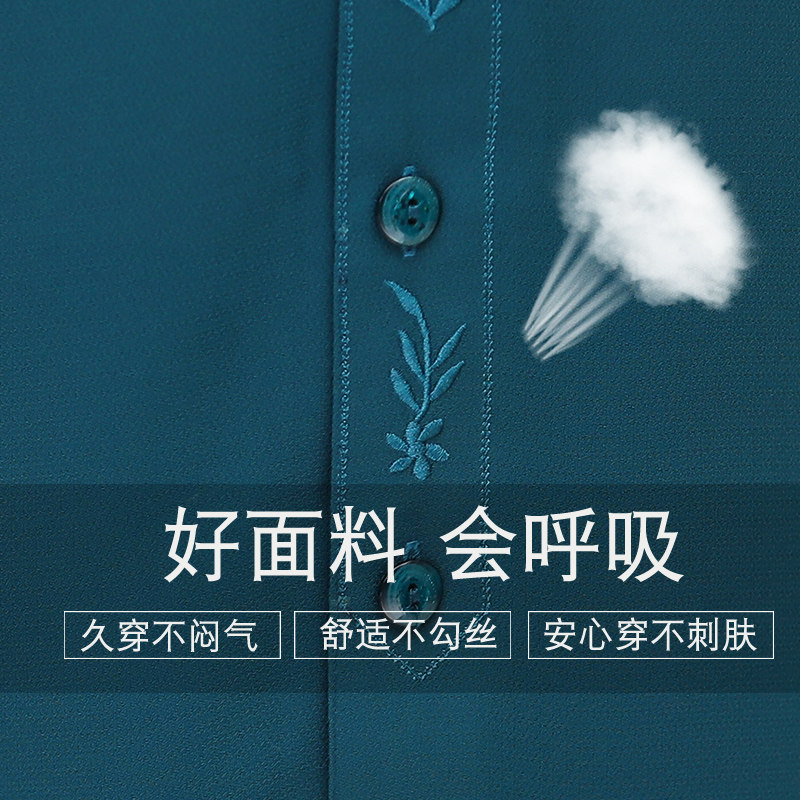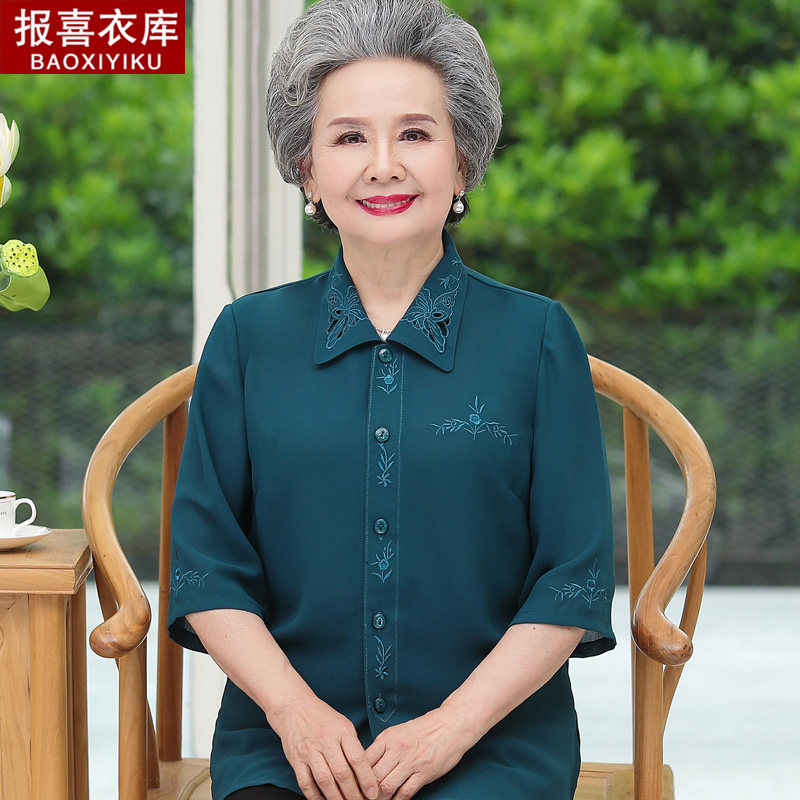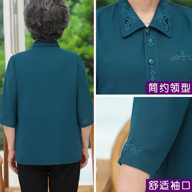 Middle-aged and elderly pure color embroidered 70% sleeves shirt female grandma Xia dress suit Mom spring dress shirt for the elderly