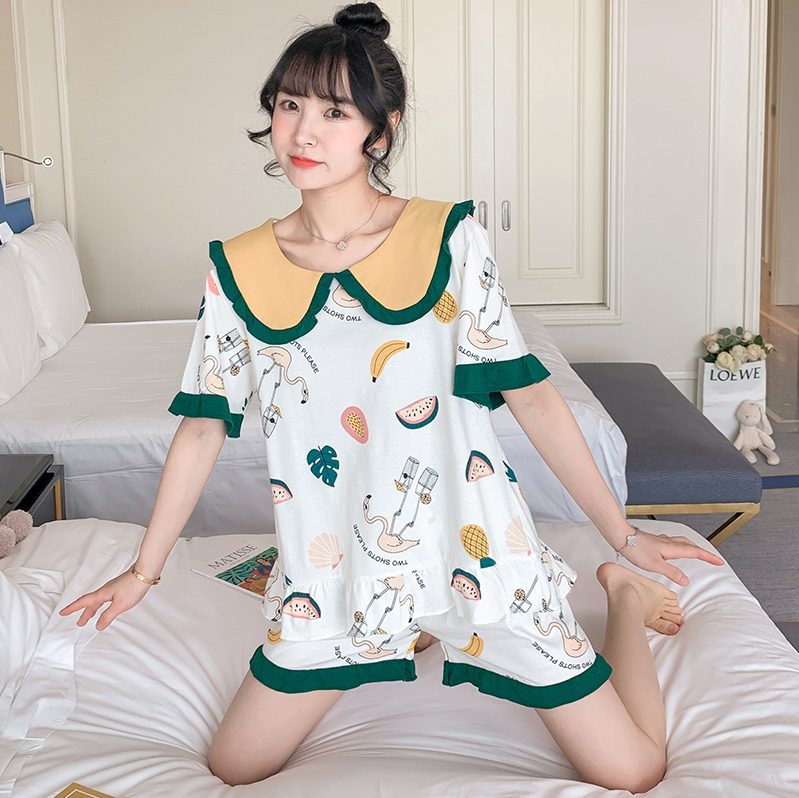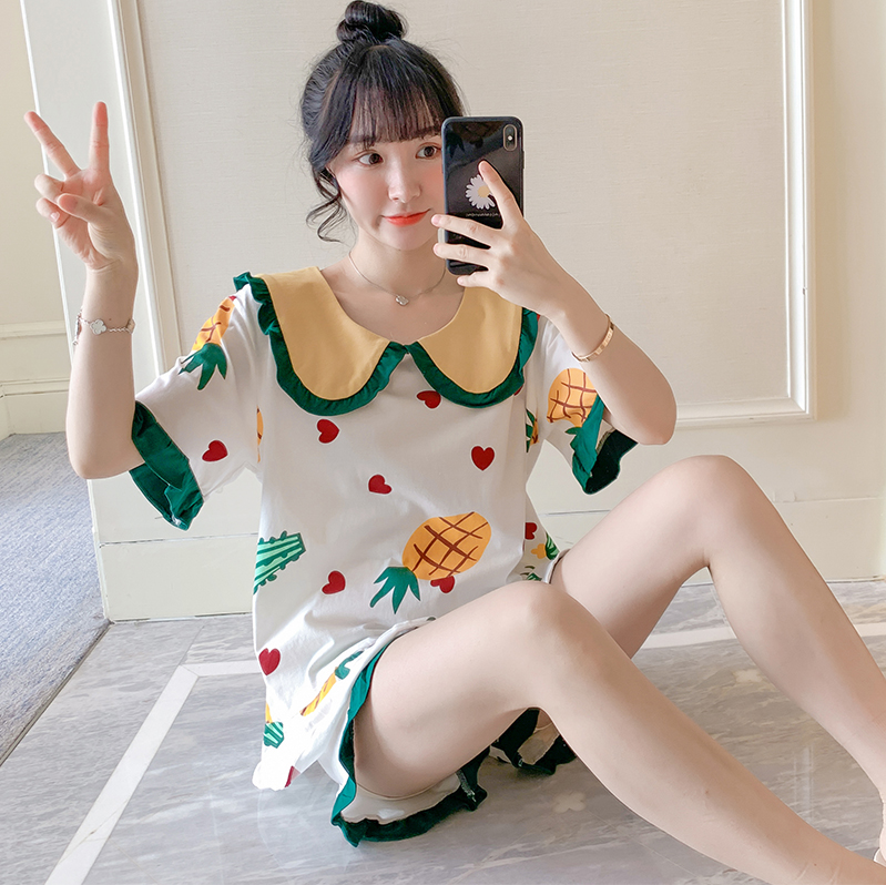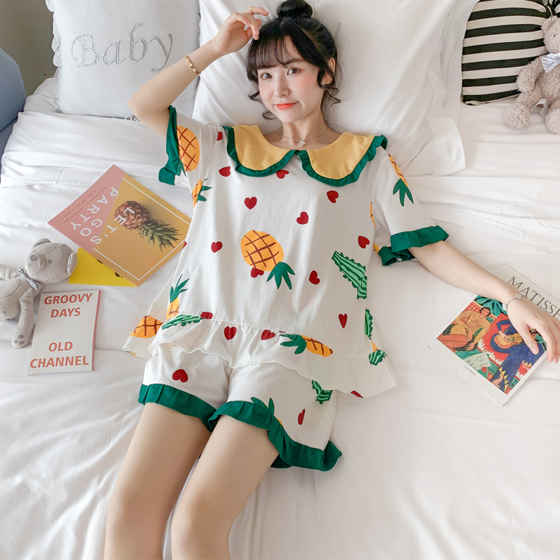 Sleepwear Woman Summer Pure Cotton Doll Collar Sweet princess Wind cute pineapple large size Size Casual Home Suit Suit can be worn out
