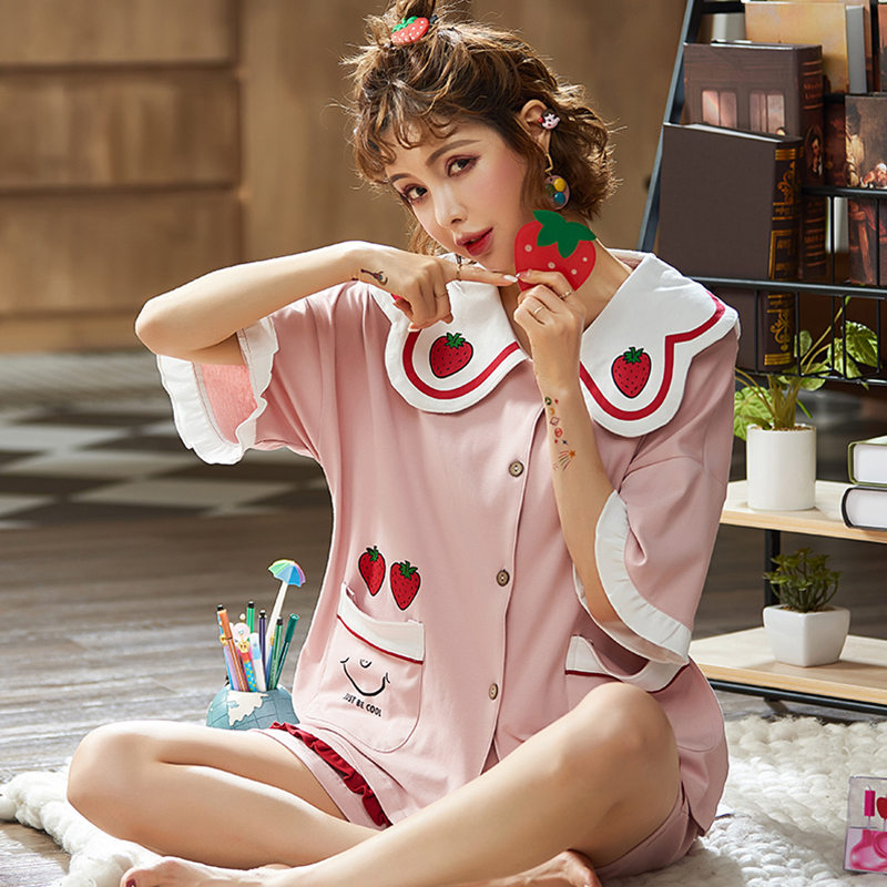Sleepwear Lady Summer Pure Cotton Cute Strawberry Short Sleeve Doll Collar Princess Wind Big Size Cardiovert Cardiovert Suit Outwear
