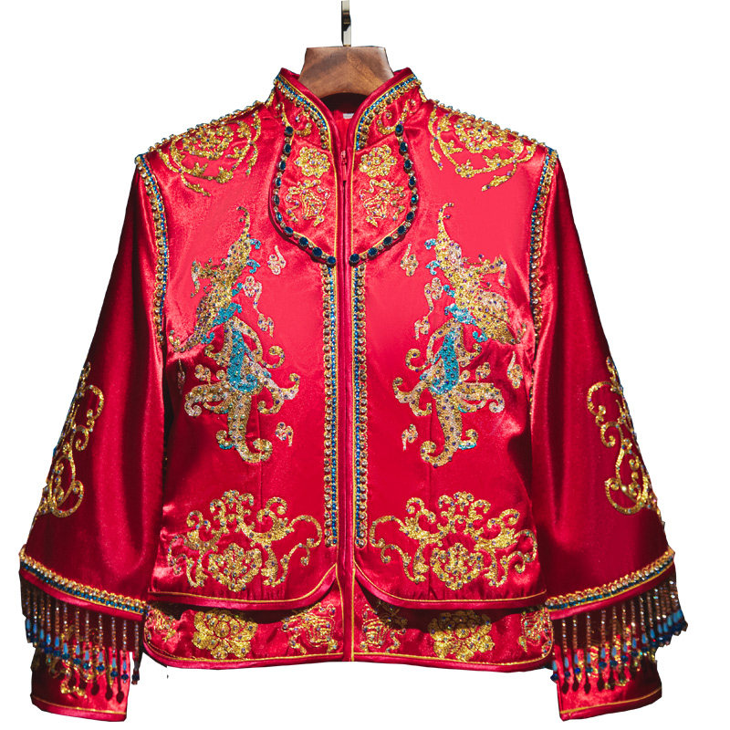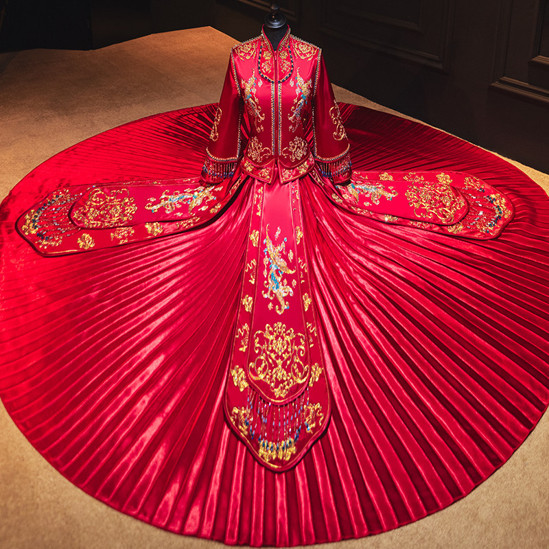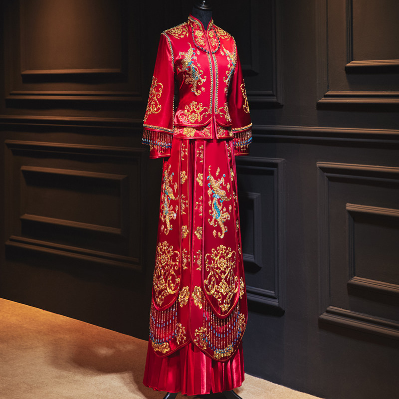 The new show and the bride are married to a vintachio, retro Chinese-style wedding gown, and a dragon and an Fenghang are thin out of the attic