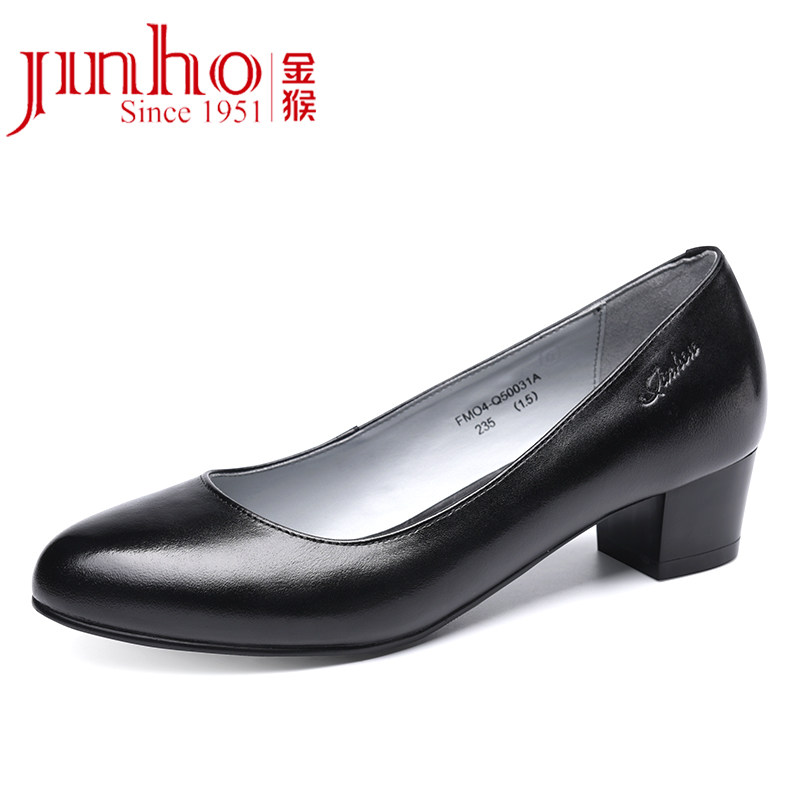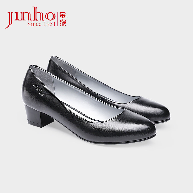 Golden monkey leather shoes women's pointed toe square heel shallow mouth black single shoes one-leg set women's professional dress commuter leather shoes
