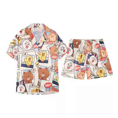 Fenten short sleeve pajamas female summer thin simulation silk long sleeve home clothing cartoon pajamas female spring and autumn cotton set