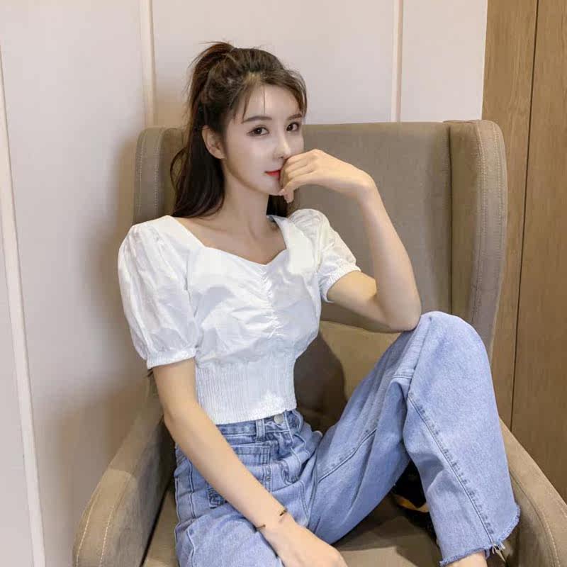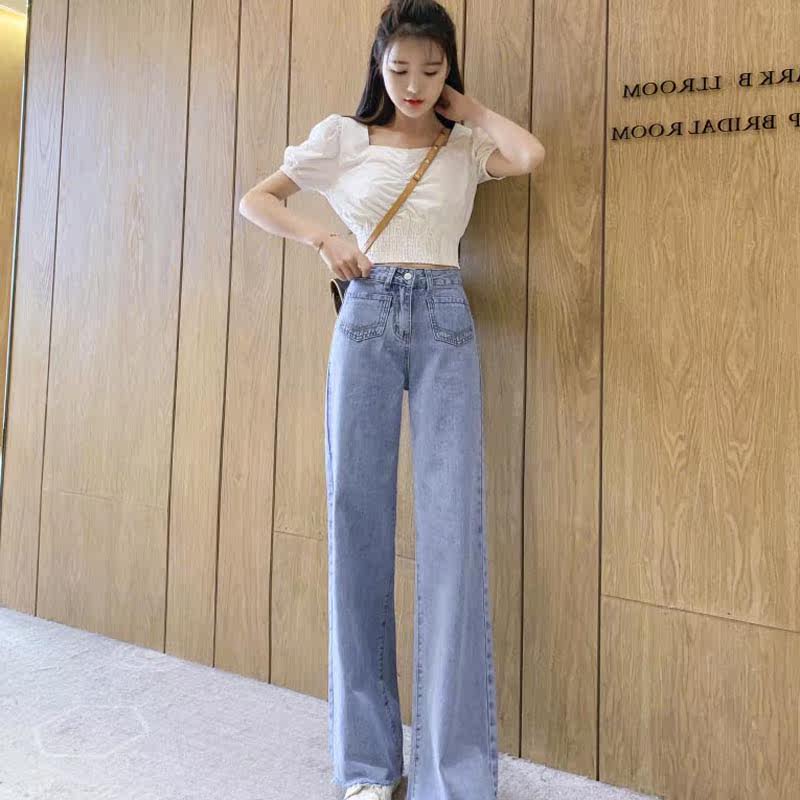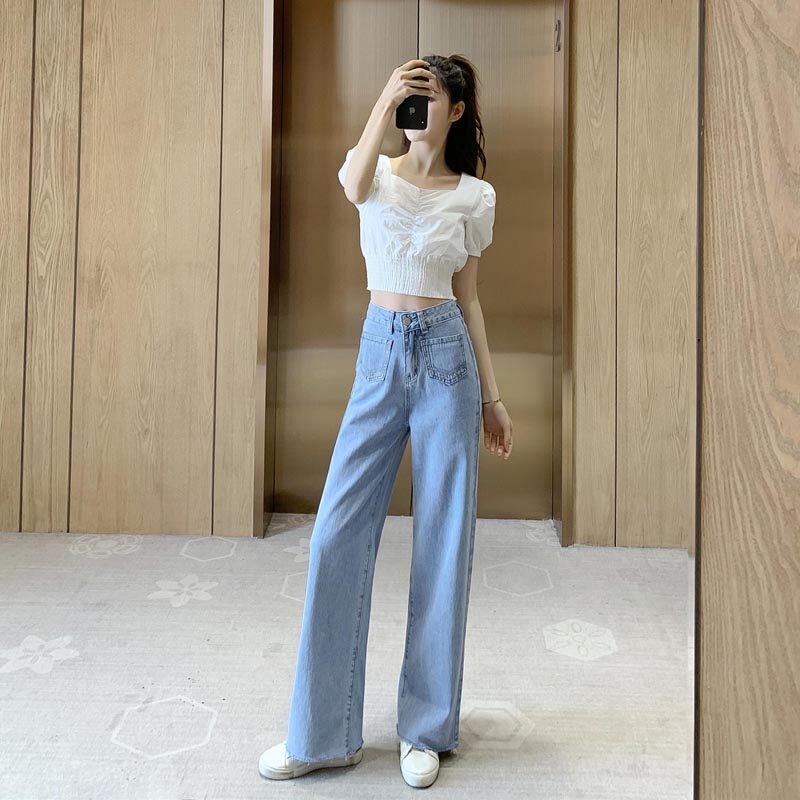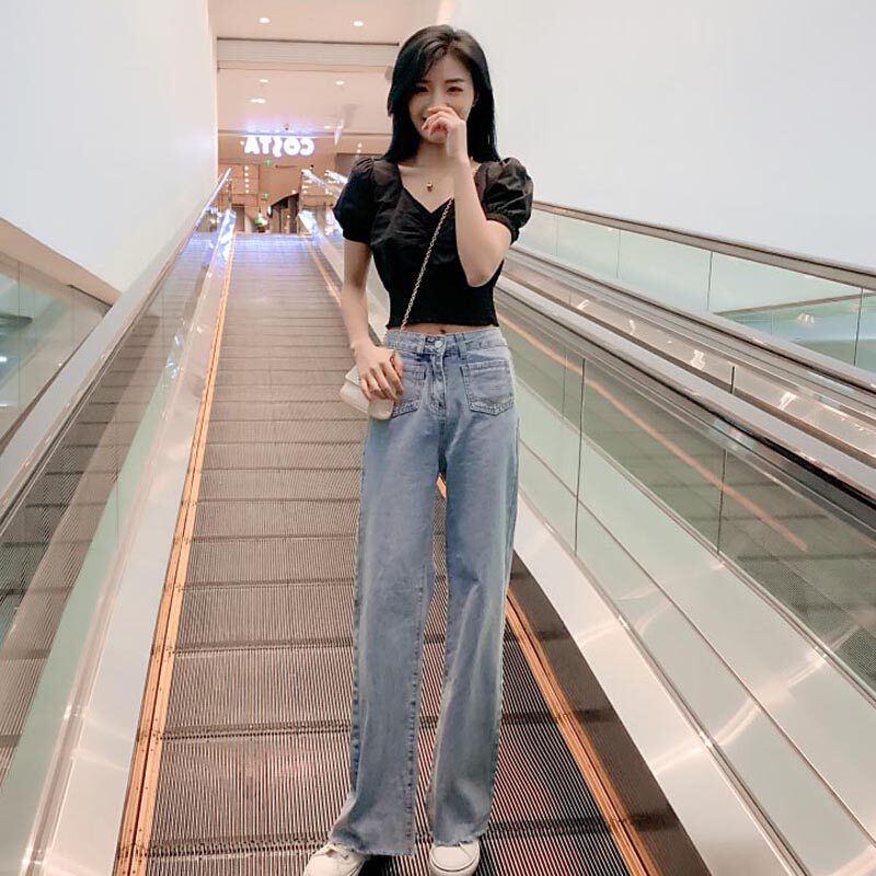 Large size summer puff sleeve black top high waist wide pants straight drop feeling mopping dad jeans suit women