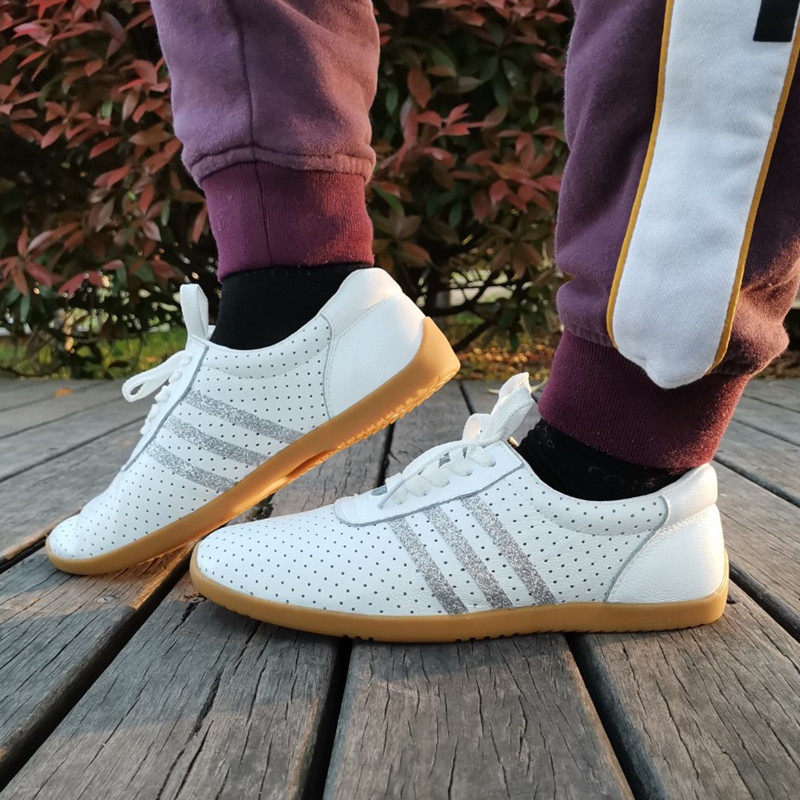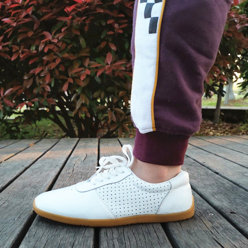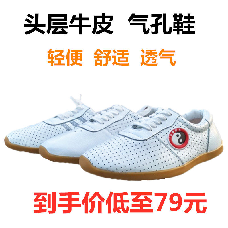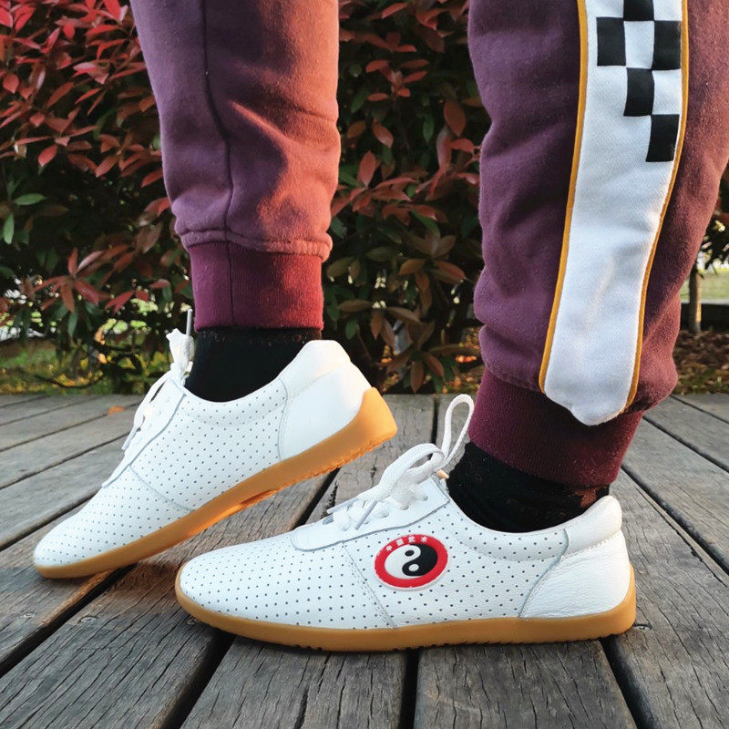 Tai chi shoes soft leather beef tendon bottom kung fu summer mesh leather martial arts sports shoes ventilation holes for men and women hollow out