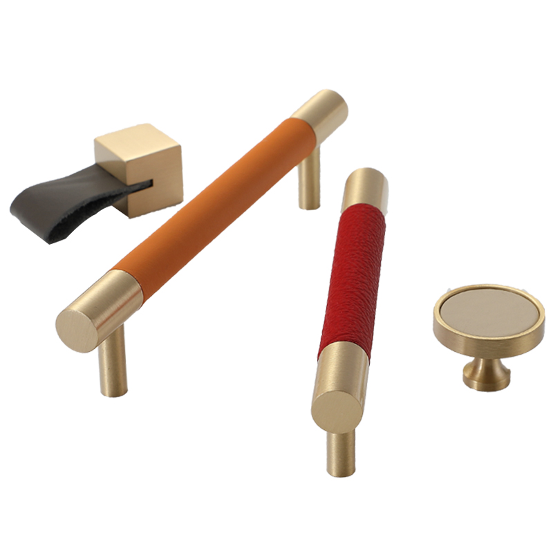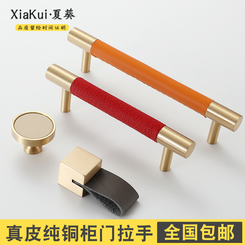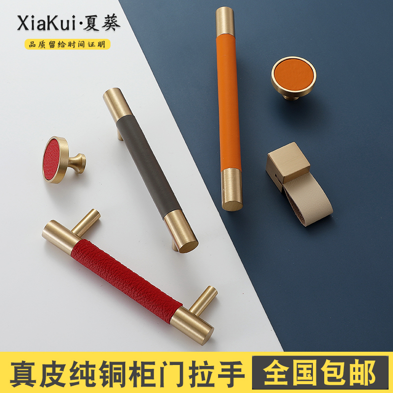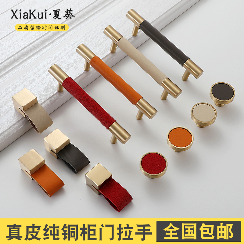 Summer Sunflower Pure Copper Cabinet Door Handle Genuine Leather Round Rod Brass Nordic Light Lavish Overall Cabinet Drawer Single Hole Golden full copper handle