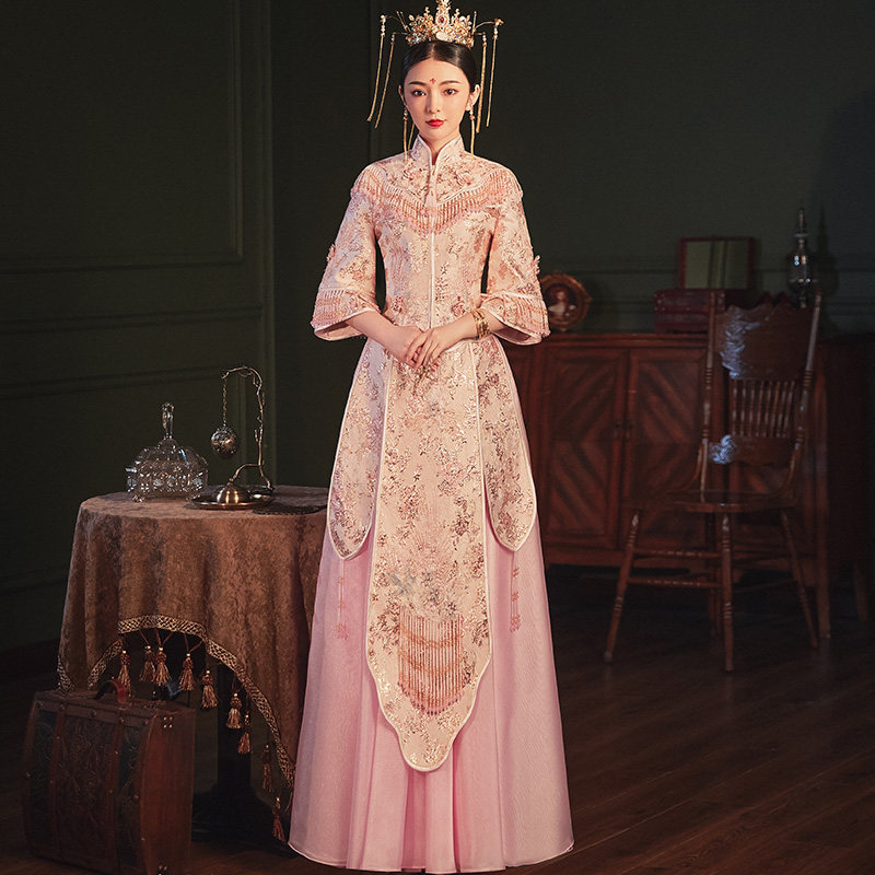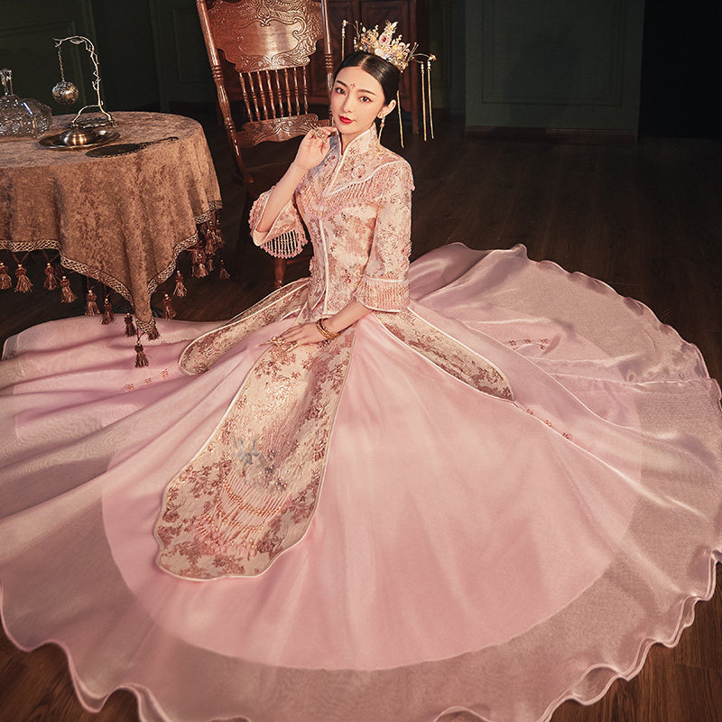Pink Show and suit 2022 new brides to marry Chinese wedding dresses The women show and the wedding dress out of the loft and show up