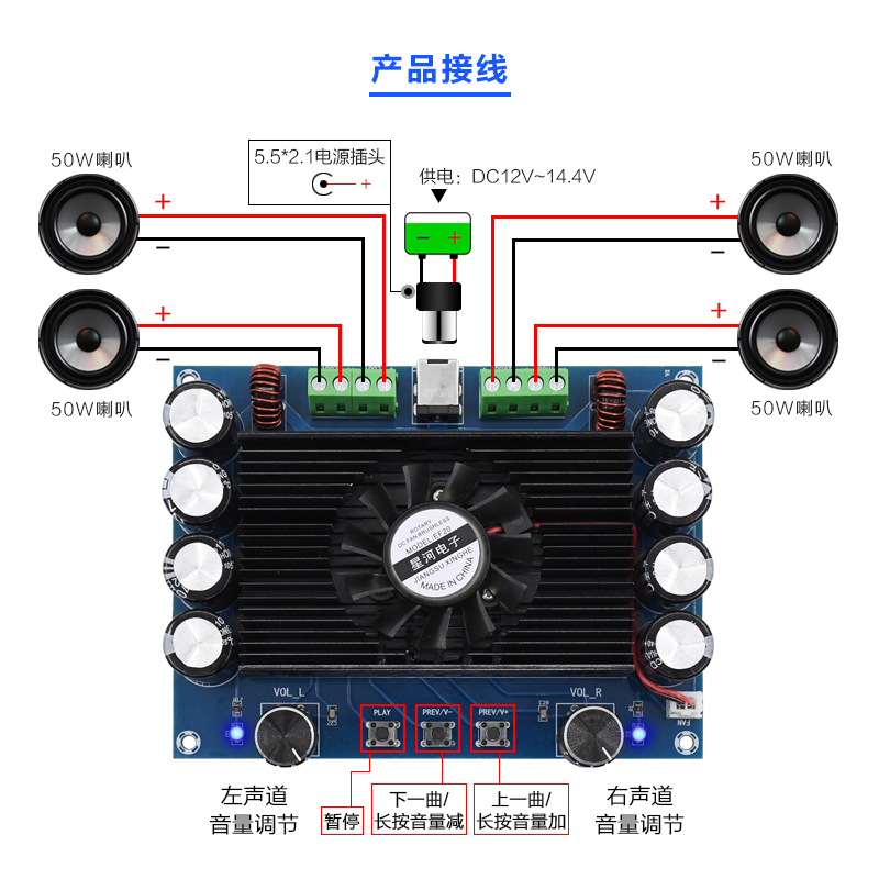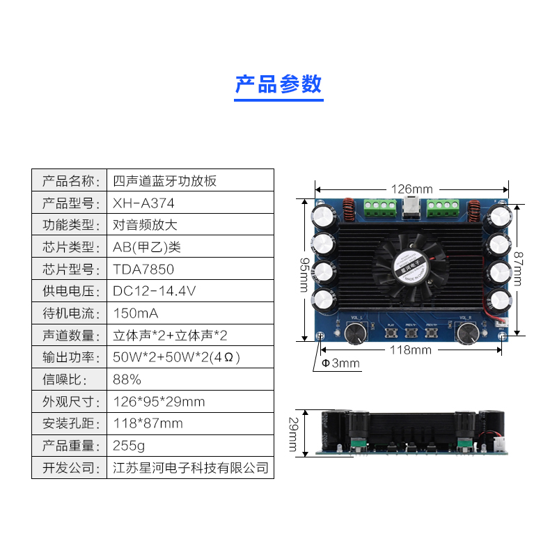 XH-A374 professional-grade car power amplifier board 4 output high power Bluetooth power amplifier module enlarged board 4 * 50W