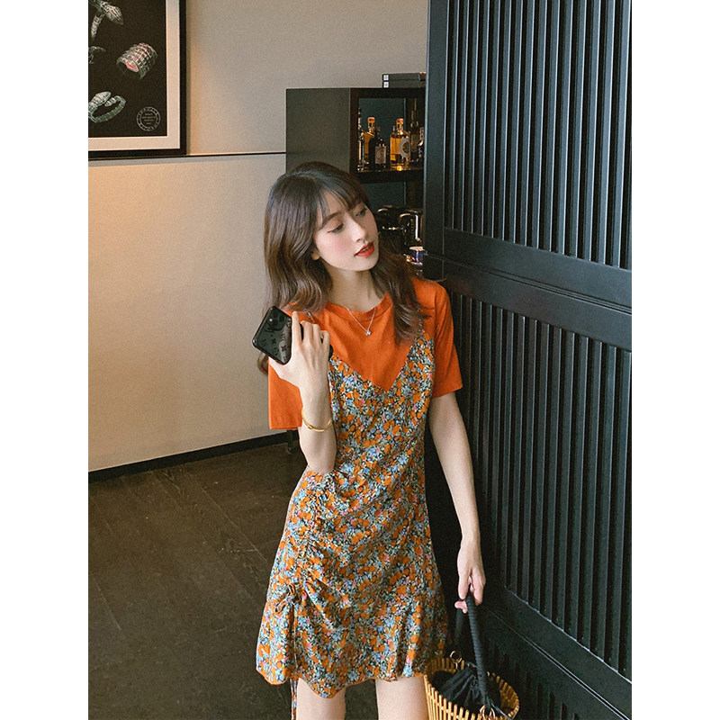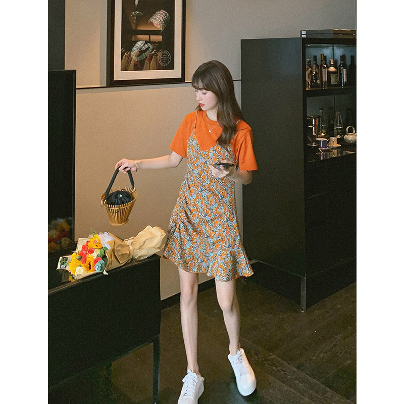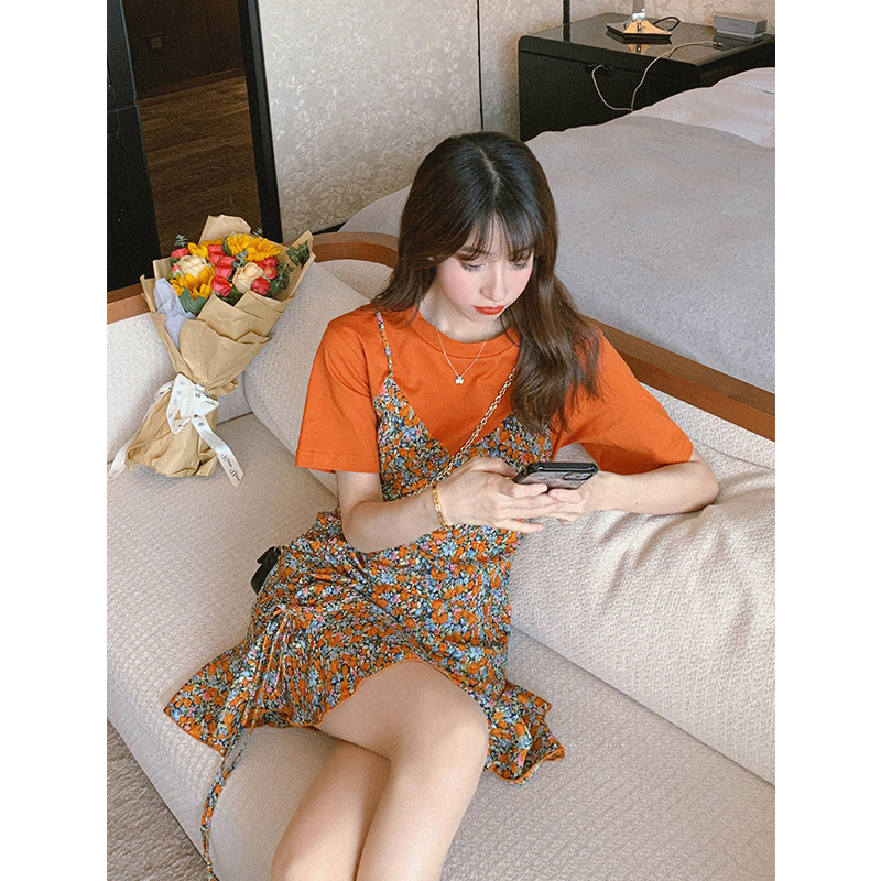 2020 Summer new women's dress Grand size Pizza Crushed Flower Harnesses Two-piece Style Suit Skirt Temperament Fan Clothing Foreign Dress