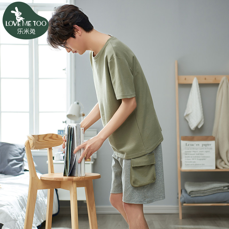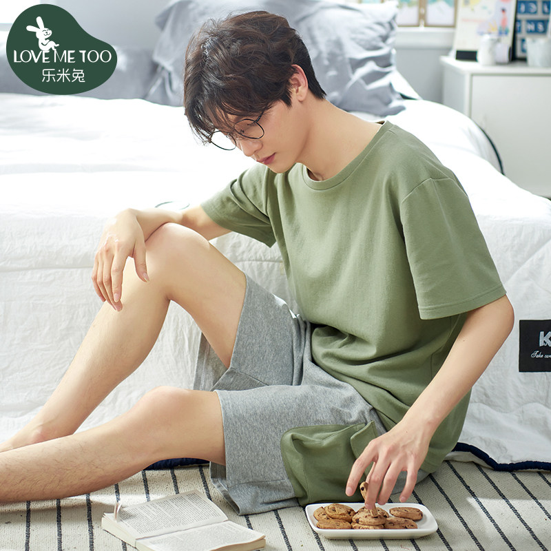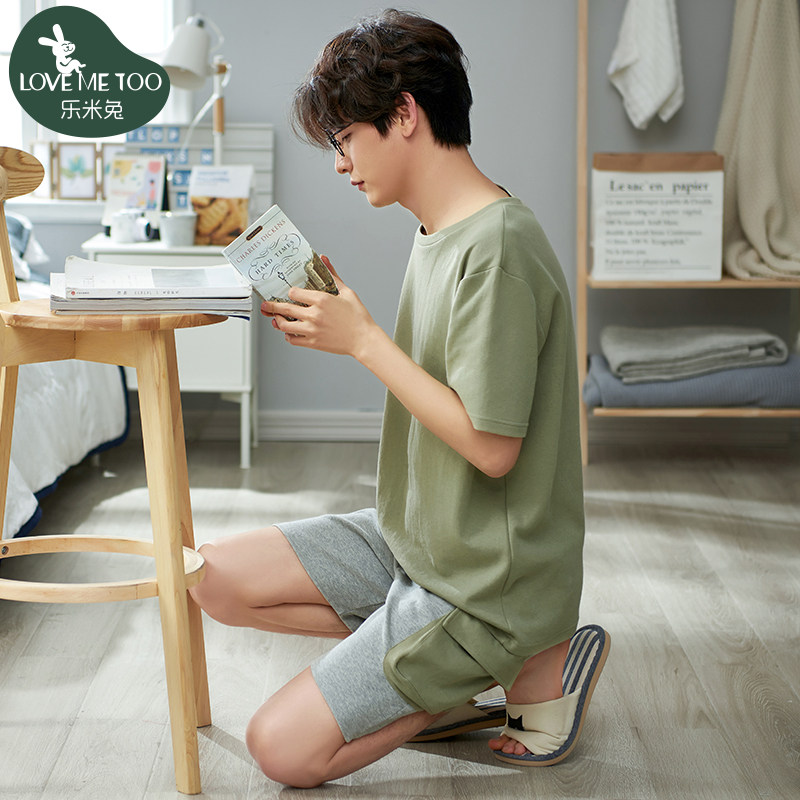 Summer cotton short-sleeved pajamas for young men's homewear suits solid color loose cotton summer thin sports outerwear