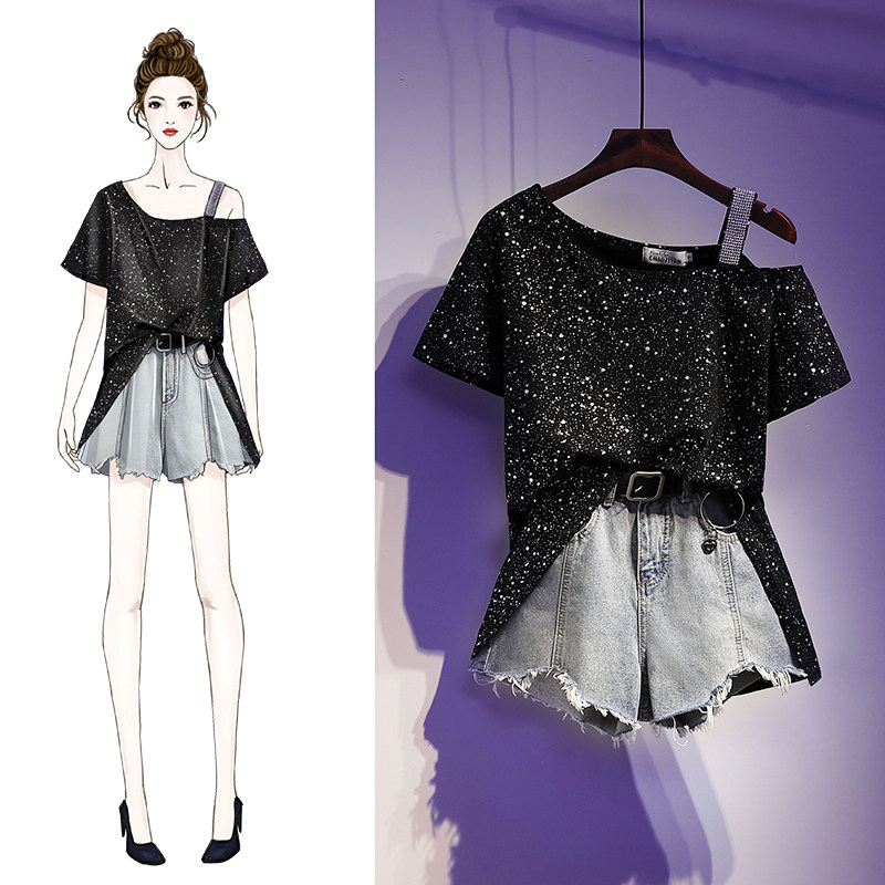Large size women's dress 2022 summer fit new foreign display slim fit-shoulder blouse Fat Sister Covered shorts Two-piece suit