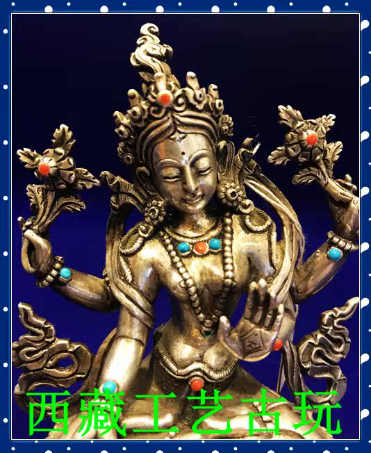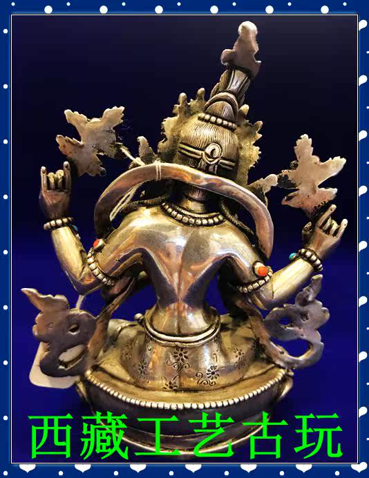 Tibetan-Tibetan Nepali craftsmanship < pure silver four arms green degree mother > boutique Buddha statue