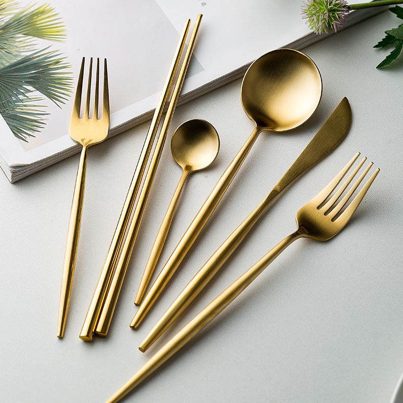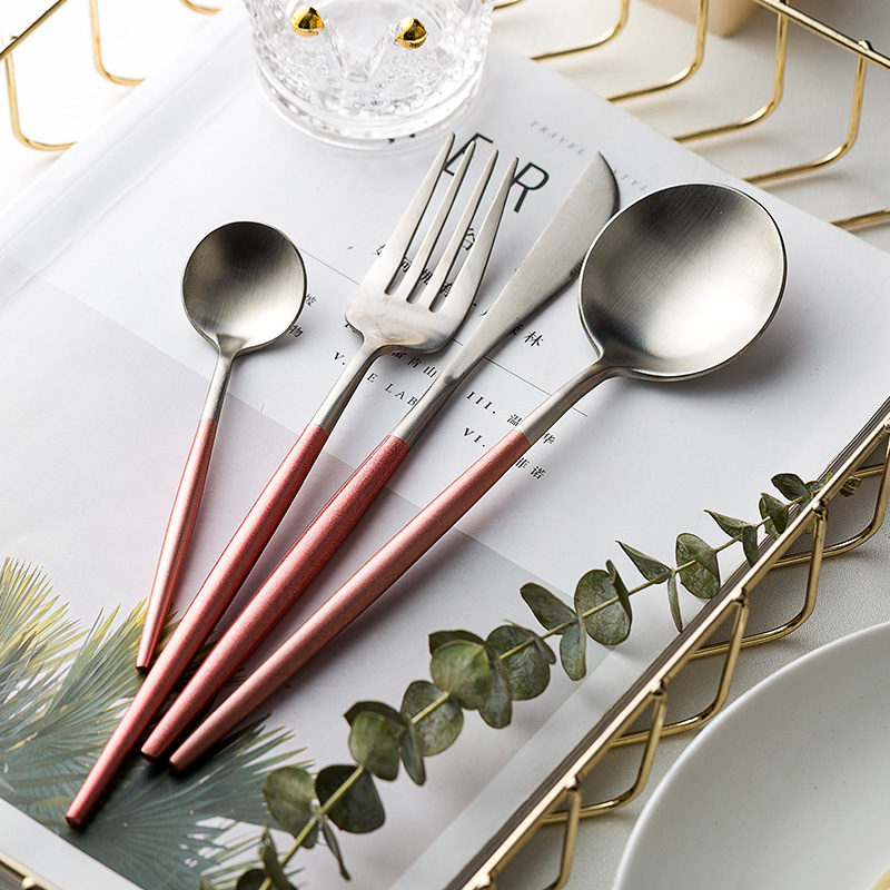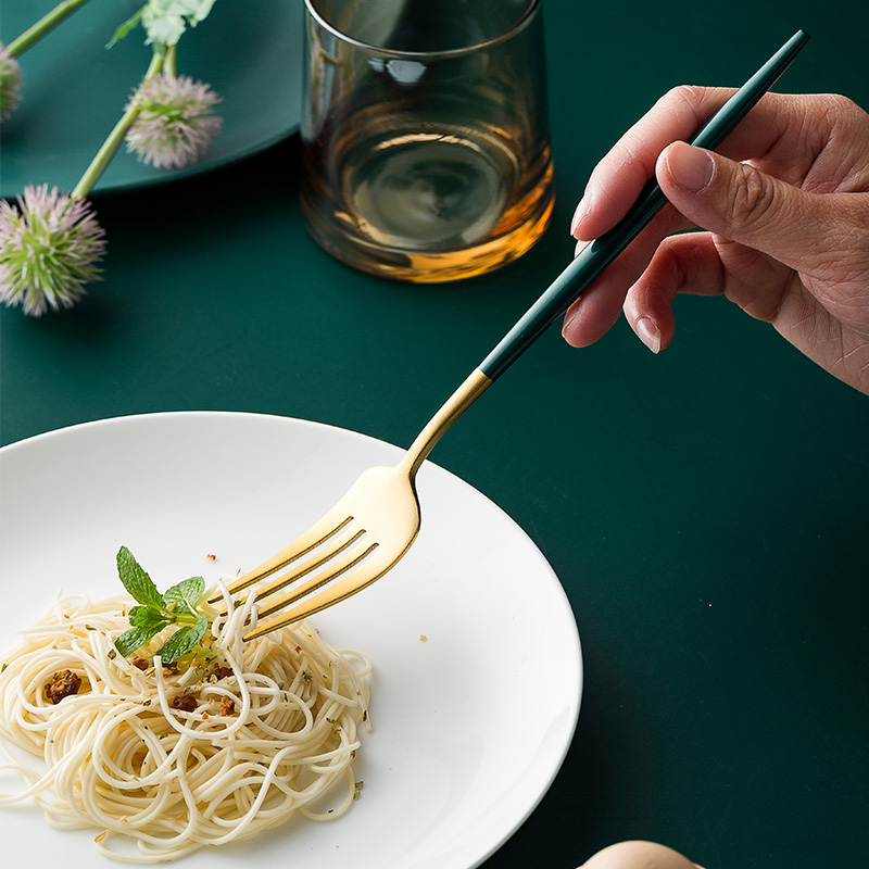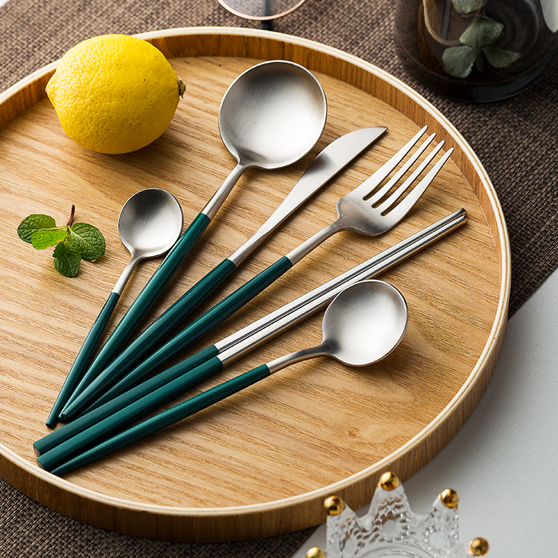 Six-piece set of cutlery, fork and spoon (green and silver) Six-piece set of cutlery, fork and spoon (green gold) Four-piece set of cutlery, fork and spoon (pink silver) Five-piece set of cutlery, fork and spoon (gold) Main table knife (green gold) Main table fork (